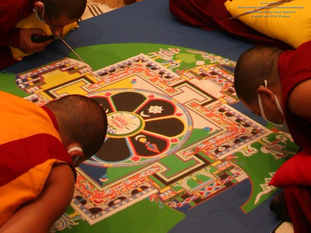 Mandalas can be both two-dimensional, image on the plane, and three-dimensional, relief. They draw on the fabric, on the sand, do colored powders and are made from metal, stone, wood. They may even cut out of oil, turning it into the appropriate ritual colors. Mandalas are often depicted on the floors, walls and ceilings of churches. Some of the mandala of colored powders perform for a certain ritual practices (eg, in the Kalachakra initiation). By the end of the ritual creation destroyed.