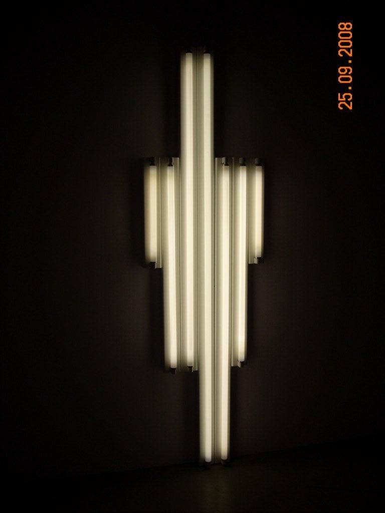 Пьеро Манцони. Черно-белый. 1962. Холст, камни, каолин. 100 х 79. Художник, запомнившийся своей страстью к пластическим материалам. На этот раз хоть каолин. Вложение 40885 Альберто Джакометти. Стоящая женщина. 1956. Отливка 1989. Сопоставимых работ на выставке несколько штук. Вложение 40895 Александер Колдер. Отличная работа, но ярлычок стоял явно не от нее, поэтому названия не скажу. Вложение 40905 Дэн Флэвин. Памятник Татлину 22. 1964. Люминесцентные лампы. Вот и мостик к русскому авангарду. Очень дорогой художник Флэвин. Но не дороже Татлина. Когда пришли на выставку вместе с Konstantin, лампы были еще выключены. Когда еще увидишь потухшего Флэвина? |