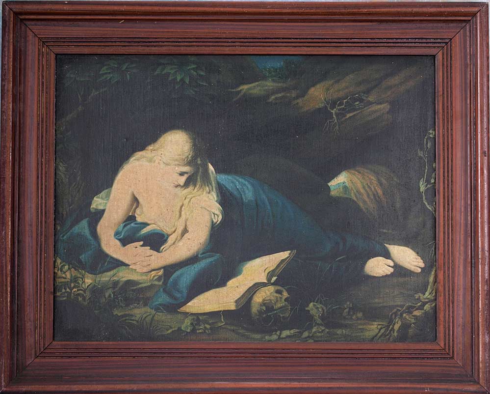 Только это же не оригинал. Да и вообще, вы не ответили на вопрос: это РЕПРОДУКЦИЯ или холст, масло? Если холст, масло, сделайте более приличные фотографии, несколько фрагментов, чтобы можно было понять, какого времени копия. Там, кажется, есть много отличий. Например, в вашей картинке есть череп, а в оригинале есть просто камень. Да и растительность тоже, кажется, разная. Словом, это, наверно, копия первой половины 19 века. И вообще производит впечатление, что это цветная литография - по вашему фото. |