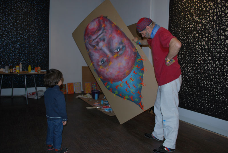 Бруй начал с фигуратива. Потом показал лессировку. А закончил демонстрацией секрета появления своих «веществ-существ». На заготовленной основе наливаются точки-лужицы краски. Потом художник руками поднимает работу в воздух и начинает вращать холст или картон, чтобы капли растеклись, образуя синхронные «пятна Роршаха». Силища нужна немереная. Неудивительно, что руки у 65-летнего Бруя – как у рестлера. Разве что галеристка недовольна, - фокусники не должны раскрывать секрета трюка. Результат полуторачаовой встречи – два больших картона. Практически законченные работы.
