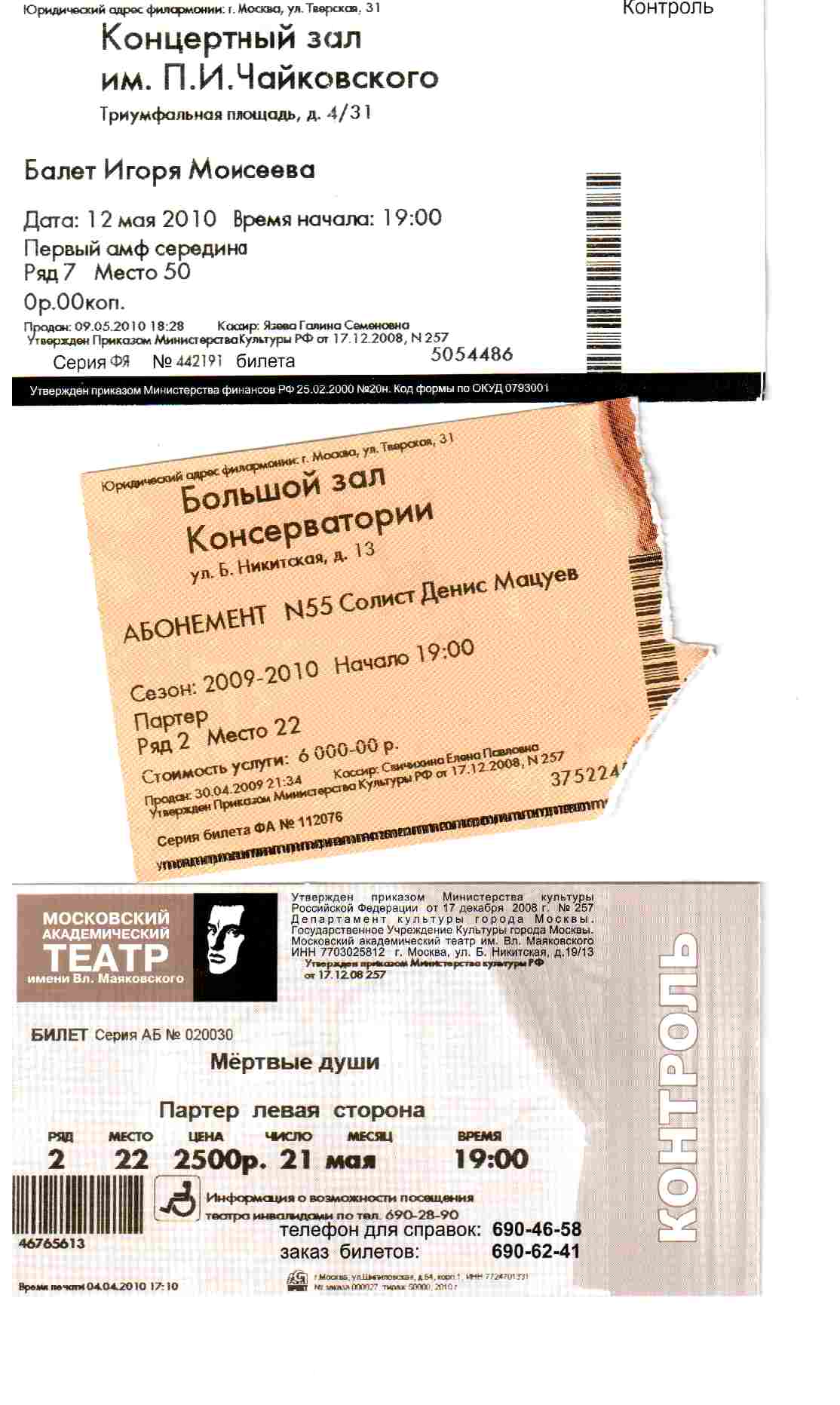 Перед ним были в зале Чайкоского на балете Игоря Моисеева (12 мая 2010). Вот уже два похода в неделю. На этой неделе идём в театр Маяковского на "Мертвые души" ( 21 мая 2010) с костяком театра в главных ролях. Назвать фамилии артистов или выслать скан билетов? Пожалуйста.