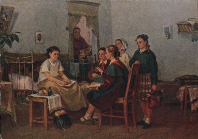 Полностью согласен. Размер, правда, великоват для квартиры - наверное, хорош будет для школы. Конец 1940-х - начало 1950-х гг. - тут можно поискать автора. Например, у А.Н. Кирчанова (1919 - 1987) есть подобный сюжет, называется "У больной подруги". Похоже и на Е.А. Кацмана (1890 - 1976). На сайтах