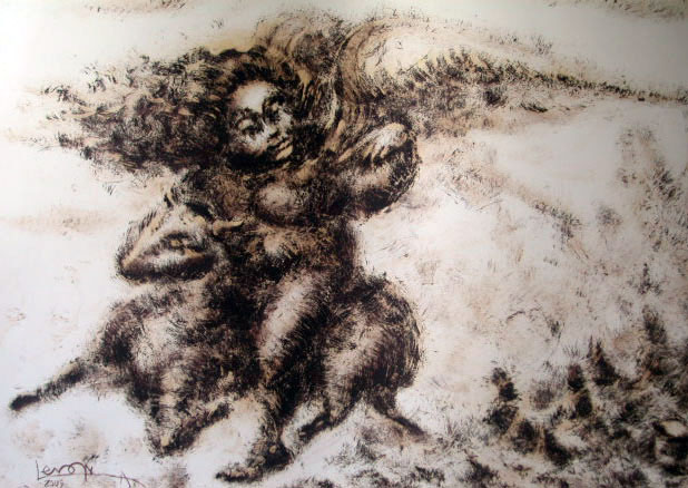 Левон часто обращается к теме бродячего театра, с ветерком в волосах путешествующих минестрелей, гистрионов, изображая пышно разодетую королевскую свиту и полусогнутых карликов. Перефразируя Шекспира, художник уверяет, что шут-ключевая фигура всей истории. Он свободен, а свобода означает в первую очередь возможность оставаться самим собой, сохраняя в себе детскую непосредственность. Маленький шут играет на огромной дуде, пронзая остроконечным колпаком, гладь реальности и настраивает округу на доброту своими музыкальными посланиями. Крутится колесо жонглера /символ быстротечности времени/, а в душе зрителя остаются его глаза, которые уже покинули арену цирка и, вонзившись в даль, скрестили два мира: мир реальный и мир фантазий.