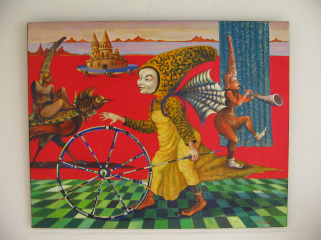 Левон часто обращается к теме бродячего театра, с ветерком в волосах путешествующих минестрелей, гистрионов, изображая пышно разодетую королевскую свиту и полусогнутых карликов. Перефразируя Шекспира, художник уверяет, что шут-ключевая фигура всей истории. Он свободен, а свобода означает в первую очередь возможность оставаться самим собой, сохраняя в себе детскую непосредственность. Маленький шут играет на огромной дуде, пронзая остроконечным колпаком, гладь реальности и настраивает округу на доброту своими музыкальными посланиями. Крутится колесо жонглера /символ быстротечности времени/, а в душе зрителя остаются его глаза, которые уже покинули арену цирка и, вонзившись в даль, скрестили два мира: мир реальный и мир фантазий.