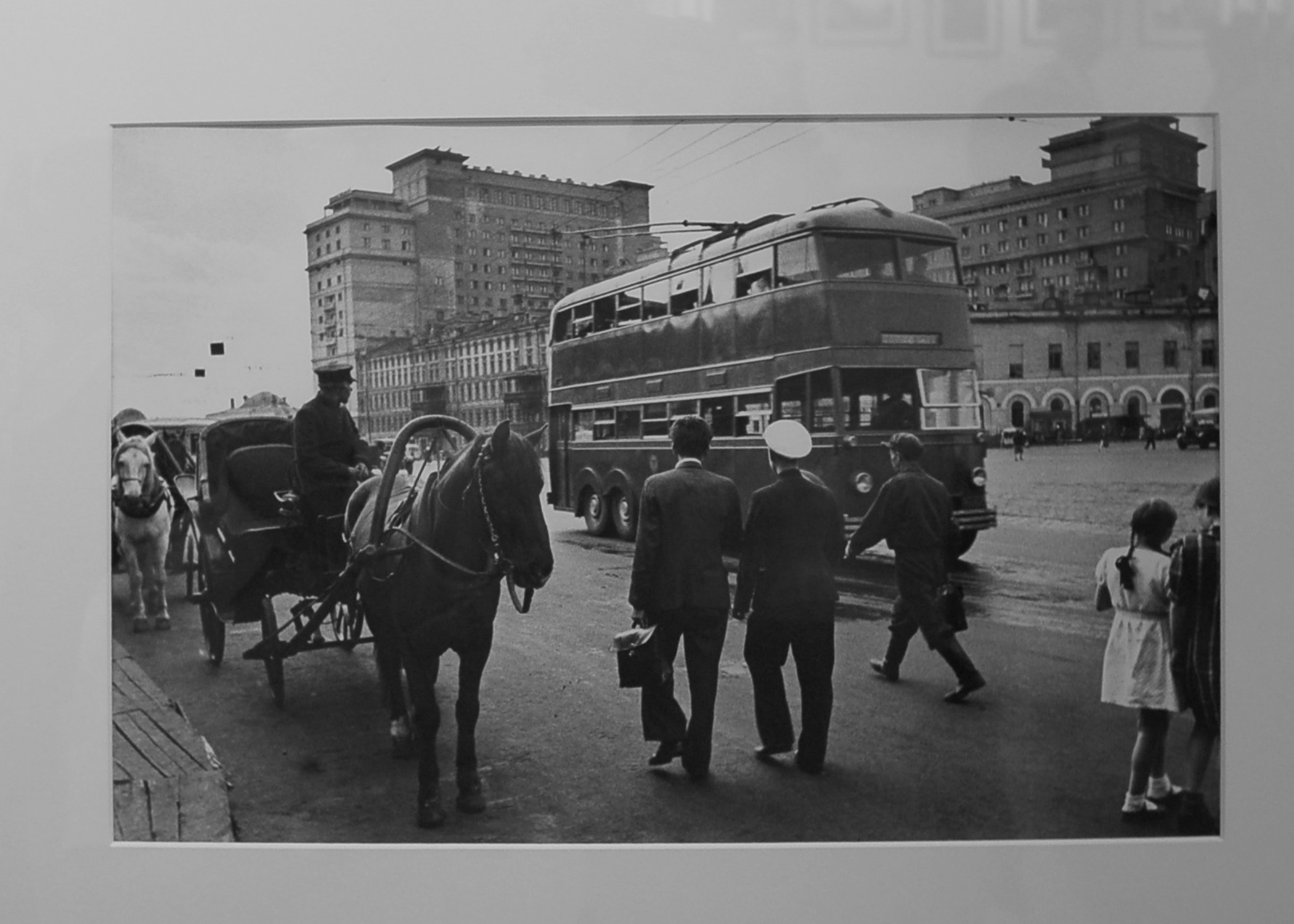 Аркадий Шайхет. Новое и старое. Извозчик и двухэтажный троллейбус. Пл. Свердлова (ныне пл. Театральная). 1935