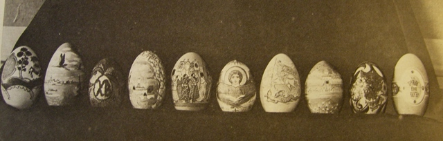 Easter eggs painted, left to right: Yaguzhinsky, Goslavlev, Zhukova, Bashilov, Protopopov, Gernet, MV Vasnetsov, Moravia, A. Vasnetsov, S. Malyutin rich.