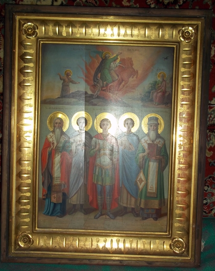 Доска с изображением в деревянном ящике, окантовка тоже полностью деревянная, все это дело закрыто рамкой со стеклом. По доске есть вертикальная трещина, но доска выполнена на двух поперечных рейках сзади, т.ч. дальше она не треснет.