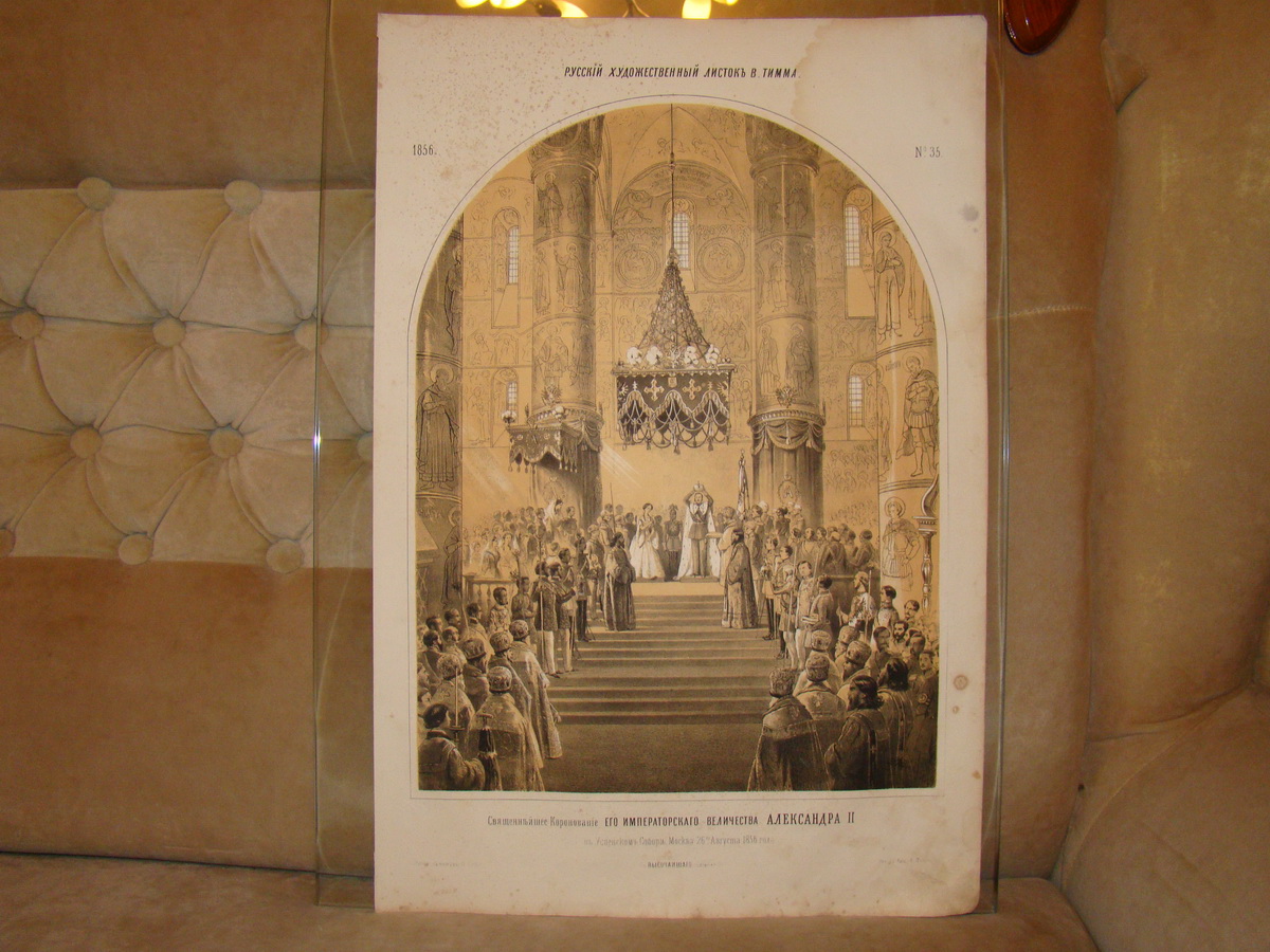 4. "Sacred coronation of His Imperial Majesty Alexander II in the Dormition Cathedral, Moscow August 26, 1856." Lithography in the two stones, height 52, width 35 cm It is a minor tear - 1 cm, otherwise very good condition, temporary spots.