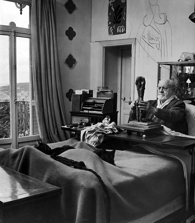 20. Анри Матисс (1869-1954) лепит обнаженную женщину, лежа в кровати в своей квартире, 1951 год. (Dmitri Kessel—Time & Life Pictures/Getty Images)