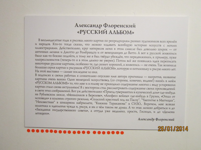 Центром притяжения стал его проект «Русский альбом» - авторская переработка русской классики, в которой «сюжет хороший, а живопись – не очень». В серию попали «Неизвестная» Крамского, «Утро в сосновом лесу» Шишкина, «Апофеоз войны» Верещагина и др. Выглядит прикольно. И вместе с тем скупыми наивными выразительными средствами удалось обеспечить полную узнаваемость. Как выяснилось идея хорошо продает себя. Значительная часть работ была куплена на закрытом показе за день до официального открытия. И это сработало как дополнительный пиар. На открытии случайно подслушал как водили какого-то коллекционера, который был недоволен, что кому-то продавали уже вчера. А его «утешали» - ничего, скоро еще будет.