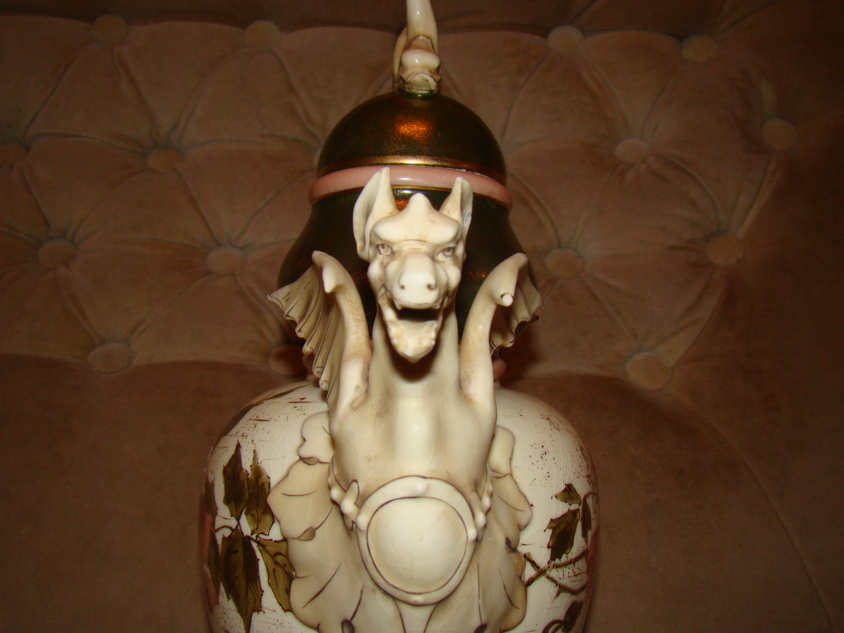 Ваза (амфора) с грифонами, фаянс, Австрия (Богемия) конца 19 века. Высота общая - ок. 30 см, без крышки - ок. 22 см, диаметр донышка ок. 9 см, расстояние между головами грифонов - ок. 27 см., диаметр горловины - ок. 5,5 см. Туловища грифонов аналогичны носикам чайника, т.е. жидкость из сосуда вытекает из пасти грифона. Есть небольшие утраты мелких деталей скульптур (сколы ушей, рога одного из грифонов; кончиков хвостов драконов на крышке).