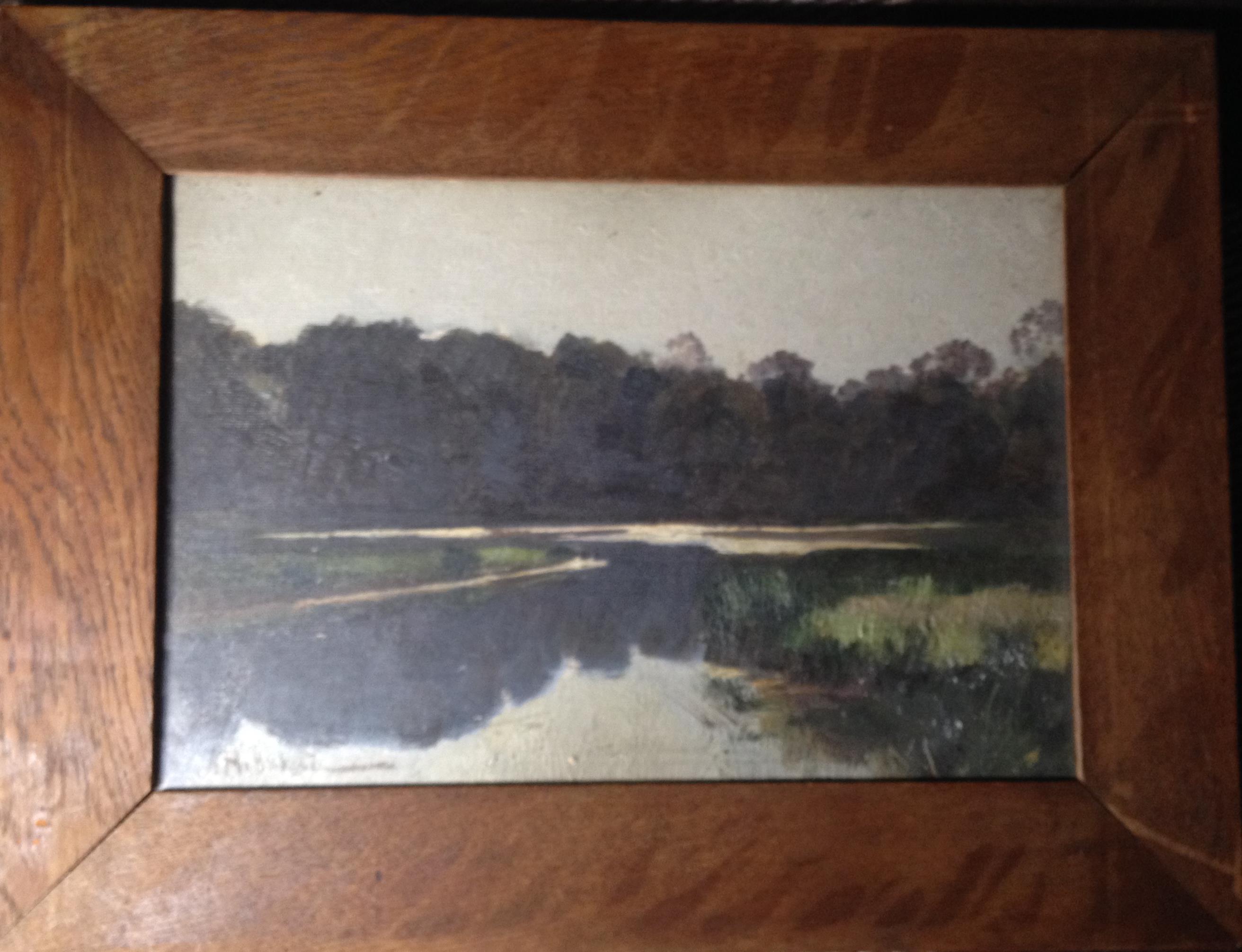 1. g) Landscape, oil on canvas on cardboard, native, an old oak frame. On the back there is a dedicatory inscription indicating that the painting was donated to the famous singer Kurzner in the halls of the Academy of Arts in 1907. Author - A. G. Novikov, a graduate of the Academy of Arts of the eighties of the 19th century, and later taught there. A member of the community on behalf of artists Kuindzhi. At the dedication bears the seal of the cash register of students of the Imperial Academy of Arts (and the signature of the Secretary of the Fund, the date of gift 1907). Dimensions with frame - h cm, without - h see