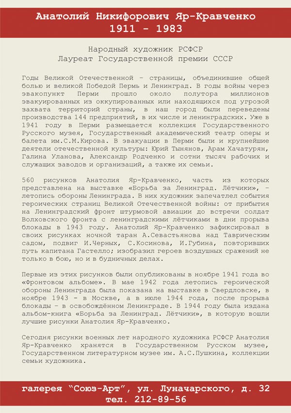 In the gallery of Union-Art (Perm) held an exhibition of works A.N.Yar-Kravchenko. The work provided the heirs of the author. The exhibition is at ul. Luchnacharskogo, 32, until May 24, 2009