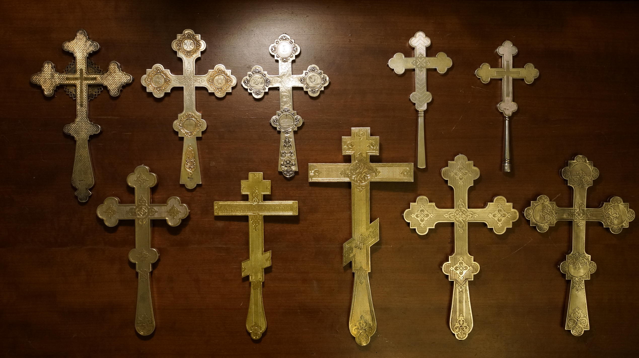 Коллекция из 10 старинных напрестольных крестов. Серебро "84" пробы, позолота. Россия, XIX век.