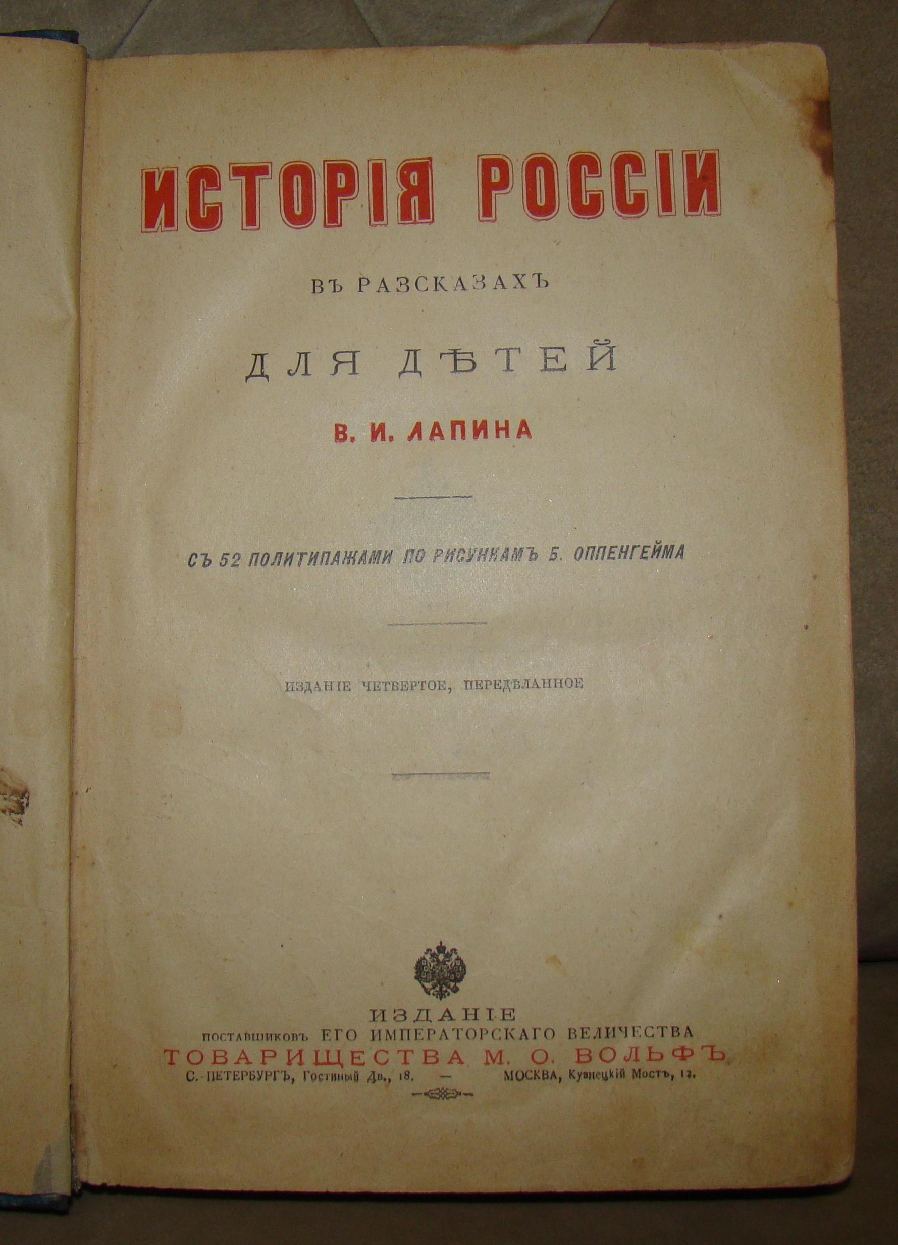 История России в рассказах для детей. 1899 год, издание М. О. Вольфа, Санкт-Петербург - Москва. Иллюстрированное издание с 52 политипажами по рисункам Б. Оппенгейма. Родной типографский переплет с золотым тиснением. Комплектный экземпляр, сохранность хорошая. Блок держится крепчайше, присутствуют временные пятна.