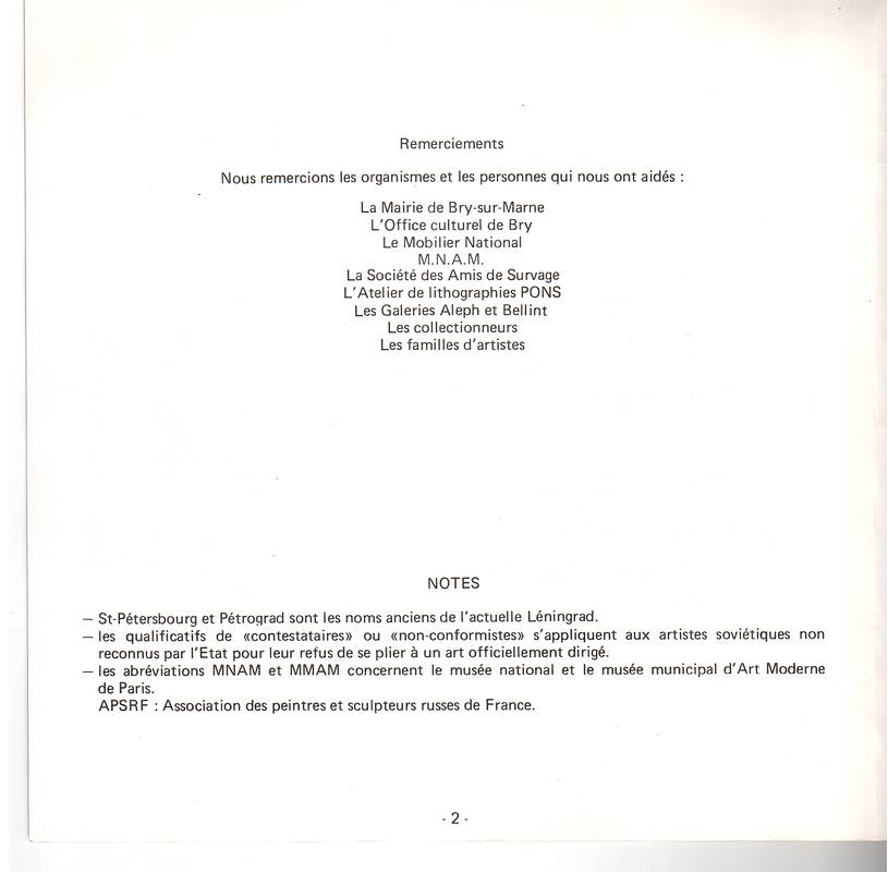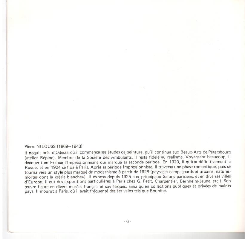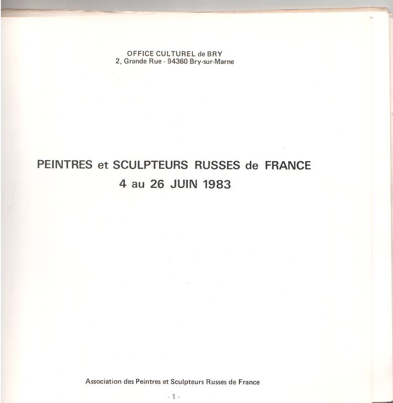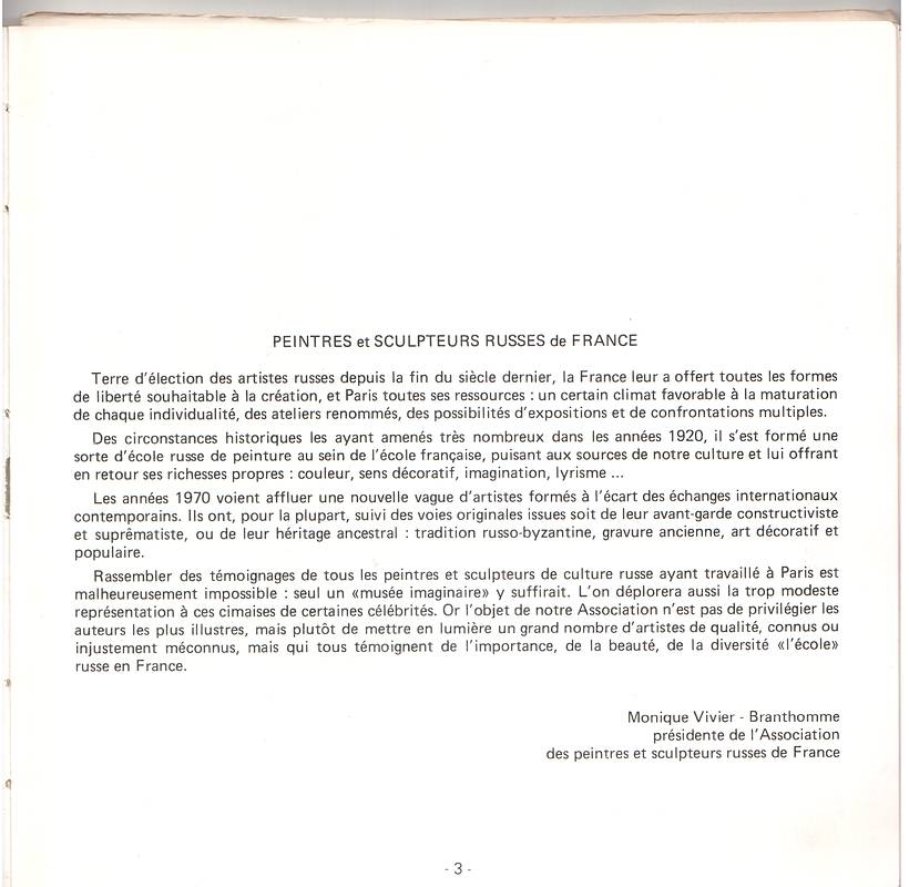 И тем не менее, я решила поместить его здесь, так как он может стать подспорьем в работе местных дилеров и галеристов, так как мне кажется, эта выставка была самой полной из всех выставок русских художников, когда-либо устраивавшихся во Франции.