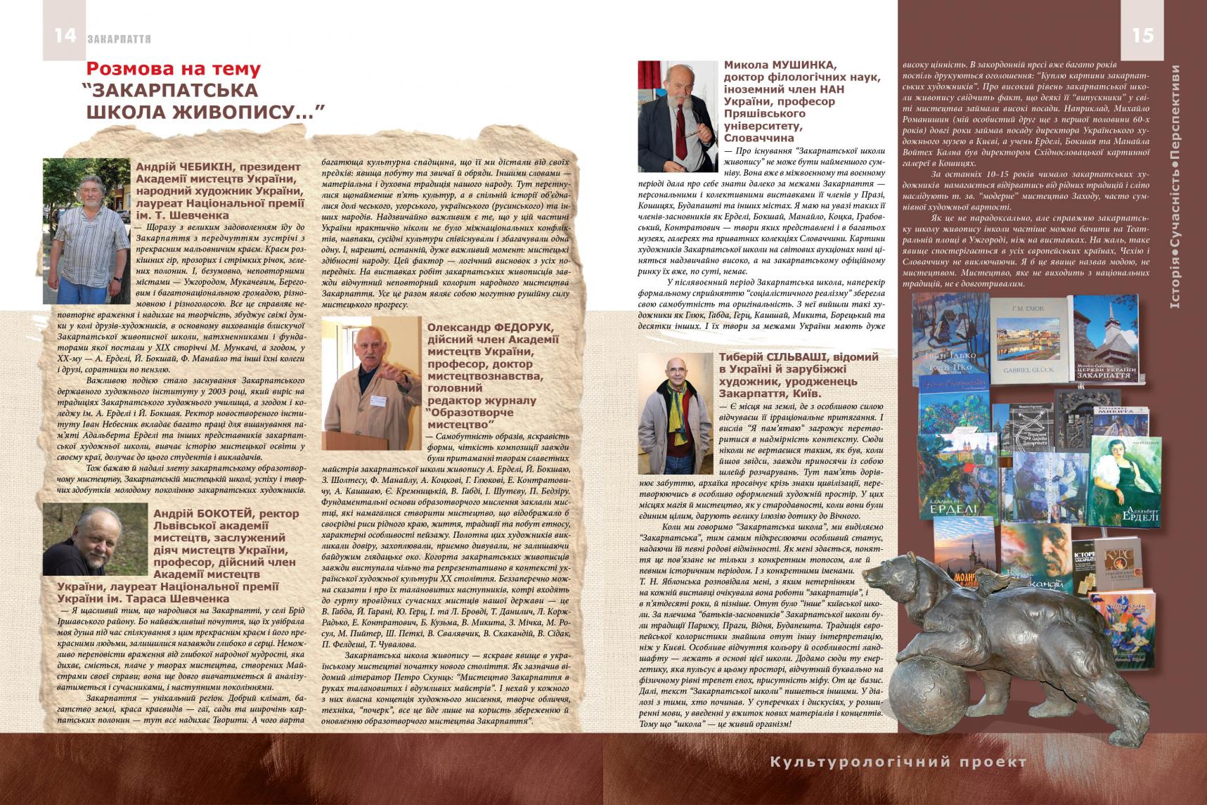 Released in the first issue of the journal Transcarpathia titled "Painters of Transcarpathia". He is completely devoted to painting of the Carpathian /including those available in the private collection of art patron of the project Zigharda Rashdorfa /and is a very good hallmark of the creative world of artists Transcarpathia. The magazine presents the history and present of the Carpathian painting, all the thematic and genre is its diversity. About 100 artists from different generations, more than 100 reproductions of their works, comments and articles art, English translation, a good design - that's a partial list of pluses of the new edition. And the magazine itself - it is only the announcement of a large two-volume, translated into 4 languages, directory, "Artists of Transcarpathia", publication of which is scheduled for spring 2010. For cooperation, participation in the project, as well as the acquisition of the magazine, and in the future and directory, you can communicate directly with the chief editor Oksana Golovchuk /e-mail: