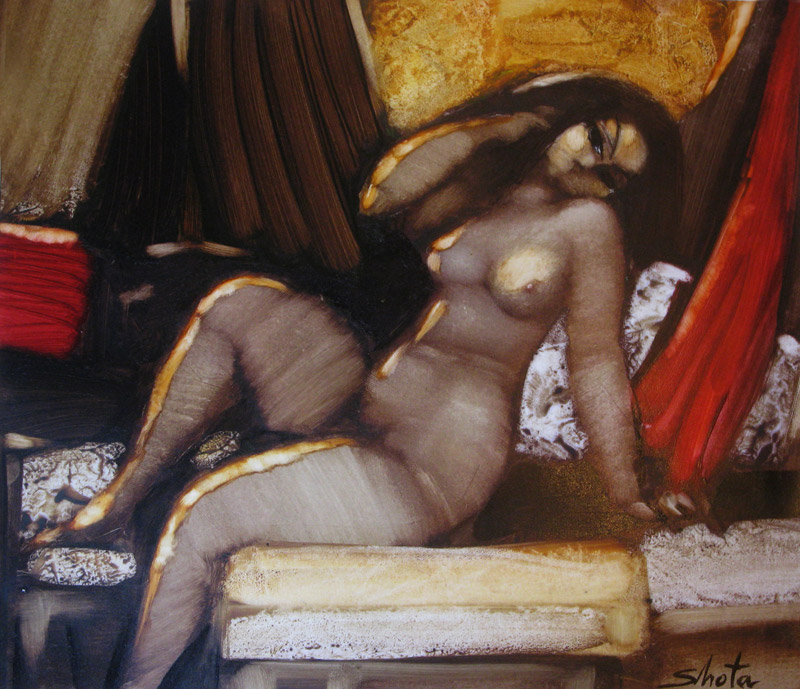 Шота переплавляет в своих работах детские впечатления в некое единство с опытом своей зрелой жизни. Такое причудливое сочетание прошлого и настоящего, реального и воображаемого приобретает у художника гармоничность даже тогда, когда соединение действий персонажей кажется абсурдом. Это вызвано тем, что в каждом эпизоде дремлет неизведанное ранее чувство или позабытое воспоминание. В итоге Шота выстраивает среду, насыщенную густым, осязаемым воздухом и светом, которые обволакивают формы, делают их по-скульптурному пластичными, наполняют потенциальной энергией. Тяжеловатые, уплотненные, словно литые, женские тела приобретают медный оттенок. Художник лепит людей и предметы, с наслаждением ощупывая их реальную материальность, передавая их выпуклости с особой пластической и колористической выразительностью. Таким же жизнеутверждающим началом исполнены его обнаженные фигуры, где художник словно заново открывает живое великолепие человеческого тела. И действительно, Шота на наших глазах с помощью цветовых пятен и бугристой нетерпеливой лепки создает фигуры, обещающие превратиться в нежную женственную восточную красоту.
