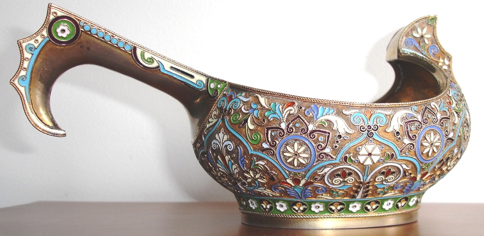 Ladle, Silver 84, etc. Polychrome enamels on filigree, gilding. Length - 185 mm Weight - 280 g. Moscow - 1908-1917gg 1911 Moscow gang 2. Ladle, Silver 84, etc. Polychrome enamel, painted by filigree, gilding. Length - 183 mm Weight - 231, the Moscow - 1908 - 1917gg 1926 Moscow gang |