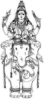 Индра — древнее ведийское божество дождя, грома и молнии. В Ведах Индра является царем всех богов. В ранний ведийский период Индра был очень могущественным божеством, его считали покровителем коров, жрецов и даже самих богов. Он аналогичен римскому Юпитеру-Громовержцу. Индра является царем звездного неба (небес), богом грома и молнии. Люди преподносят Индре его любимый напиток — сок Сомы. Тогда молния, ассоциирующаяся с Индрой, начинает метать свои стрелы в демона Вриттру, и Вриттра ревет от боли и спасается бегством, вода проливается вниз на иссушенную землю, и все радуются — люди, животные и растения. В божественной иерархии его положение ниже, чем у божественной триады Шива-Вишну-Брахма. Позднее Индру начали называть хозяином и властелином сварги (svarga) — небесного рая, куда отправляются души погибших в бою воинов, основное же занятие Индры — выявлять человеческие слабости. |