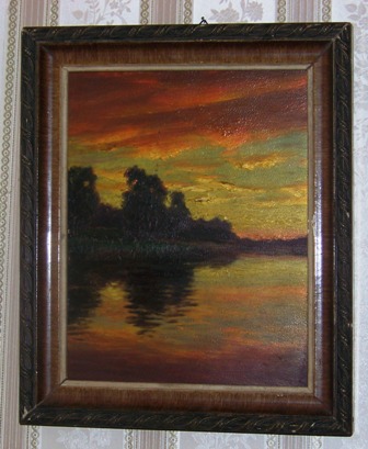 Масло на фанере. В левом нижнем углу подпись процарапанная (видимо обратной стороной кисти) и дата "17". Подпись непохожа на каталожную,но на обратной стороне кар"тины имеется надпись карандашом еле читаемая от времени - "И.Шульце
