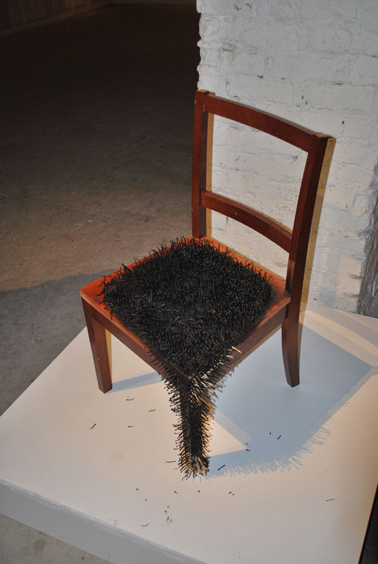 В галерее Галерея М&Ю Гельман – проект Галлюцинация Ербола Мельдибекова и Нурбосына Ориса. Продлится до 10 марта. Комментарий Андрея Ковалева здесь: http://www.guelman.ru/gallery/moscow/meldibekov/ Проект казахского художника и его помощника о времени и трансформациях в широком смысле. Кроме мятых кастрюль и тазов из запоминающегося есть серия трансформированных бюстов Ленина, стул со сгоревшими спичками и ковер из железных щеток. От «галлюцинации» с Лениным тянет китайским поп-артом. Наверное, потому, что идеи витают в воздухе.