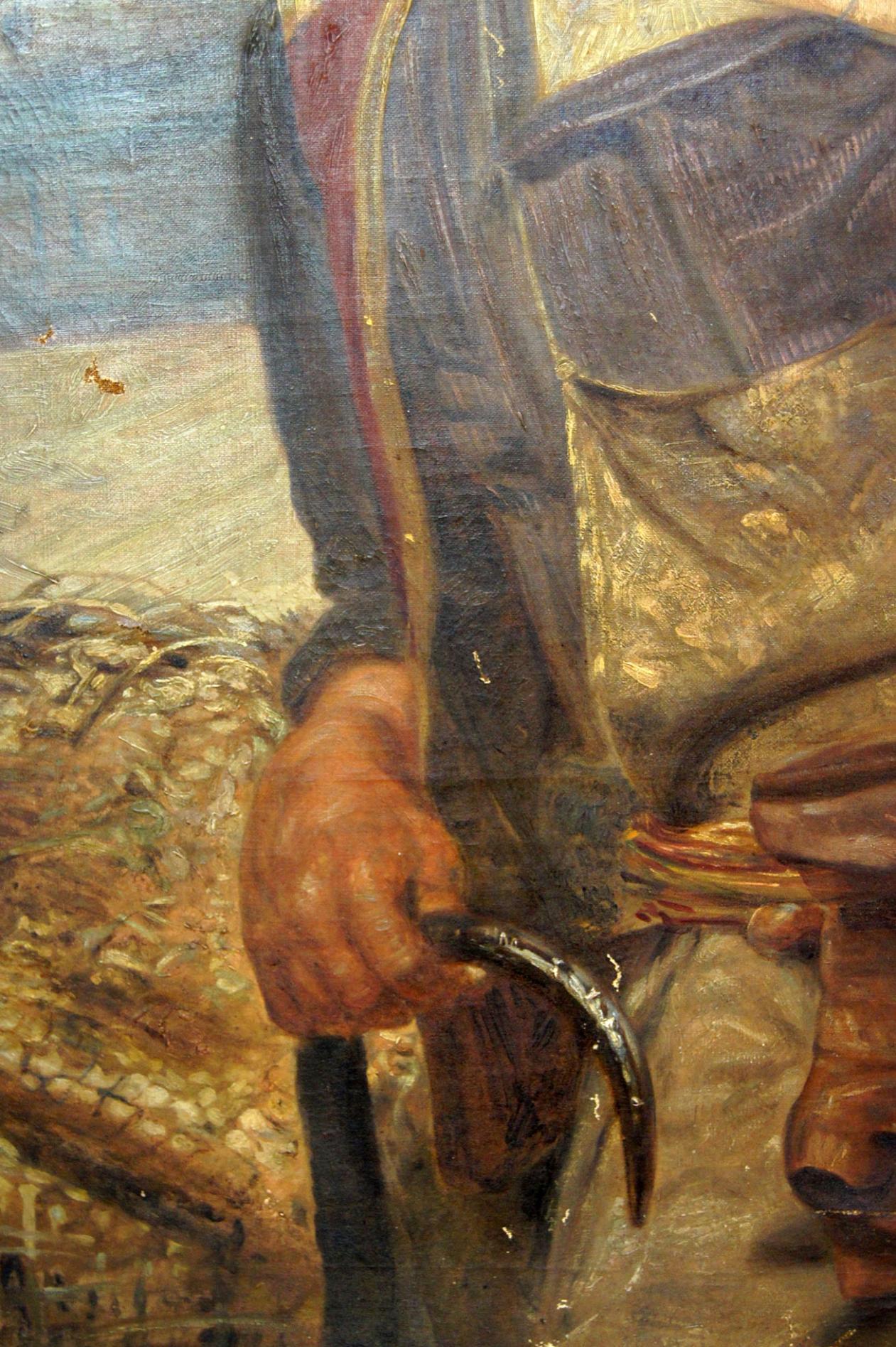Accidentally got a picture. The previous owners said they drew their grandfather . But I think that they just did not know. Family professorial (medicine), but the older generation is gone, but young people do not need anything . This is the background . The size of the picture 134h99 see an old canvas , see the edge of the picture, dubbed in the old canvas. There are small tears and abrasions of the canvas . In the lower right corner to read the date 1888. On the internet walks image " Kryuchnika " size 60h49 but see a slightly different execution. In the State Tretyakov Gallery is a pencil drawing in 1893 similar to the picture. I want to know your opinion on this work. |
