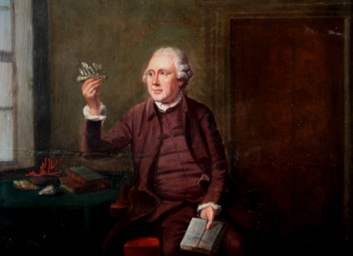 Судя по атрибутам, возможно, изображен основоположник кристаллографии Жан-Батист Роме де Лиль (Jean-Baptiste Romé de L'Isle, 1736 - 1790).