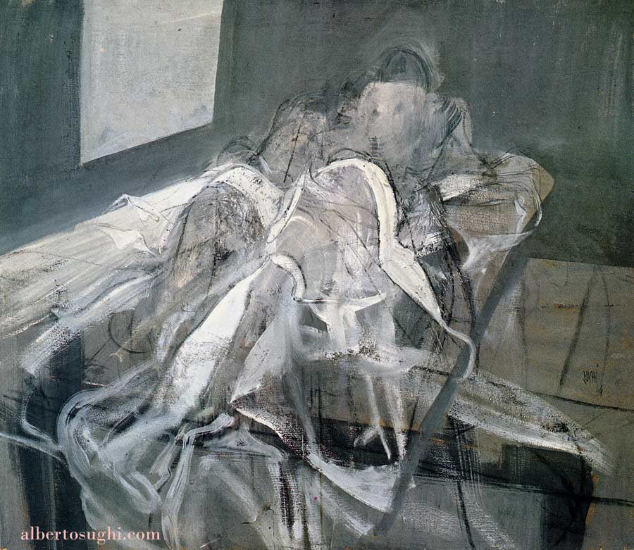 Некоторым критикам, которые считают его картины тех лет как депрессивные и мучительные Альберто Суги отвечал: "Начиная с моих первых выставок в Риме в 50-е годы, я сделал любопытное открытие о моих работах говорили, что они грустные и унылые ... Но я никогда не использовал серый цвет для придания печали и розовый для надежды. Когда рисуешь, ум и рука действуют с целью и решимостью. Цель живописи не разжалобить, а представлять ". В те годы было принято говорить об Альберто Суги как о реалисте, Antonello Trombadori ставил его в один ряд с Эдвардом Хоппером. |