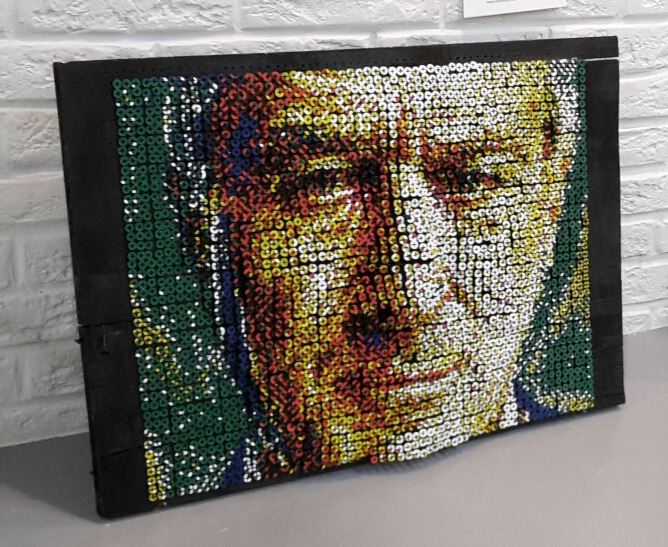 Артема я до этого хорошо знал как сильного художника в мире цифрового дизайна, но его станковые работы увидел впервые. В этот раз он показал портреты, но не классические двумерные, а рельефные. Технически свои рельефы (я бы назвал их фикс-рельефами) художник создает при помощи плотно ввернутых в доску шурупов-саморезов. Их шляпки образуют почти сплошной рельеф – изгибы лица. А потом каждая шляпка этого текстурного «маскарона» логически делится на четыре части и раскрашивается акрилом вручную. Словом, получается технически сложная многодельная живопись. И за каждым портретом (Дэнни Трехо, Роберт Де Ниро и пр.) стоят многие часы работы. На фото мало кто догадается, что это саморезы. Шляпки видны только при увеличении. Но живьем смотрится весьма эффектно. В общем, запоминайте.