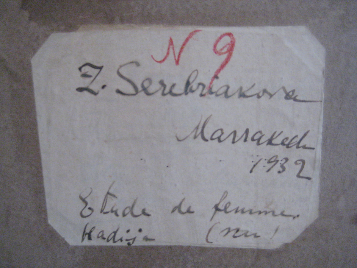 Смыт слой (возможно, с предыдущей подписью), сверху нанесена другая подпись "Z.Serebriakova". С затеком жидкой краски в кракелюр. Сверху вся поверхность картины покрыта восковым лаком. В УФ ничего не светится. Продавец утверждает, что реставрация проводилась в 1955 году. Видел под микроскопом только маленький натюрморт. Большой не видел.
