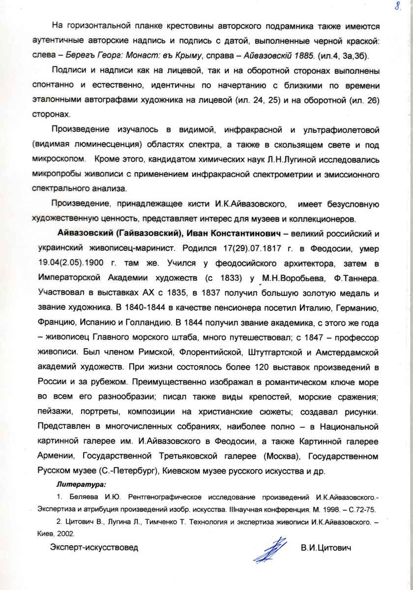 Помогите собрать информацию по данной картине: есть экс.-атр. заключение, есть фото, все ниже, возникают следующие вопросы: 1. разные названия на фотографиях - на экзате - "Берег Георгиевского монастыря в Крыму", на результатах анализа пигмента картины - "парусник у берега", действительное название картины? 2. экспертиза подписана - В.И.Цитович. 3. размер 61,7х97,2 - 1885 г. 4. примерная стоимость на сегодня... |