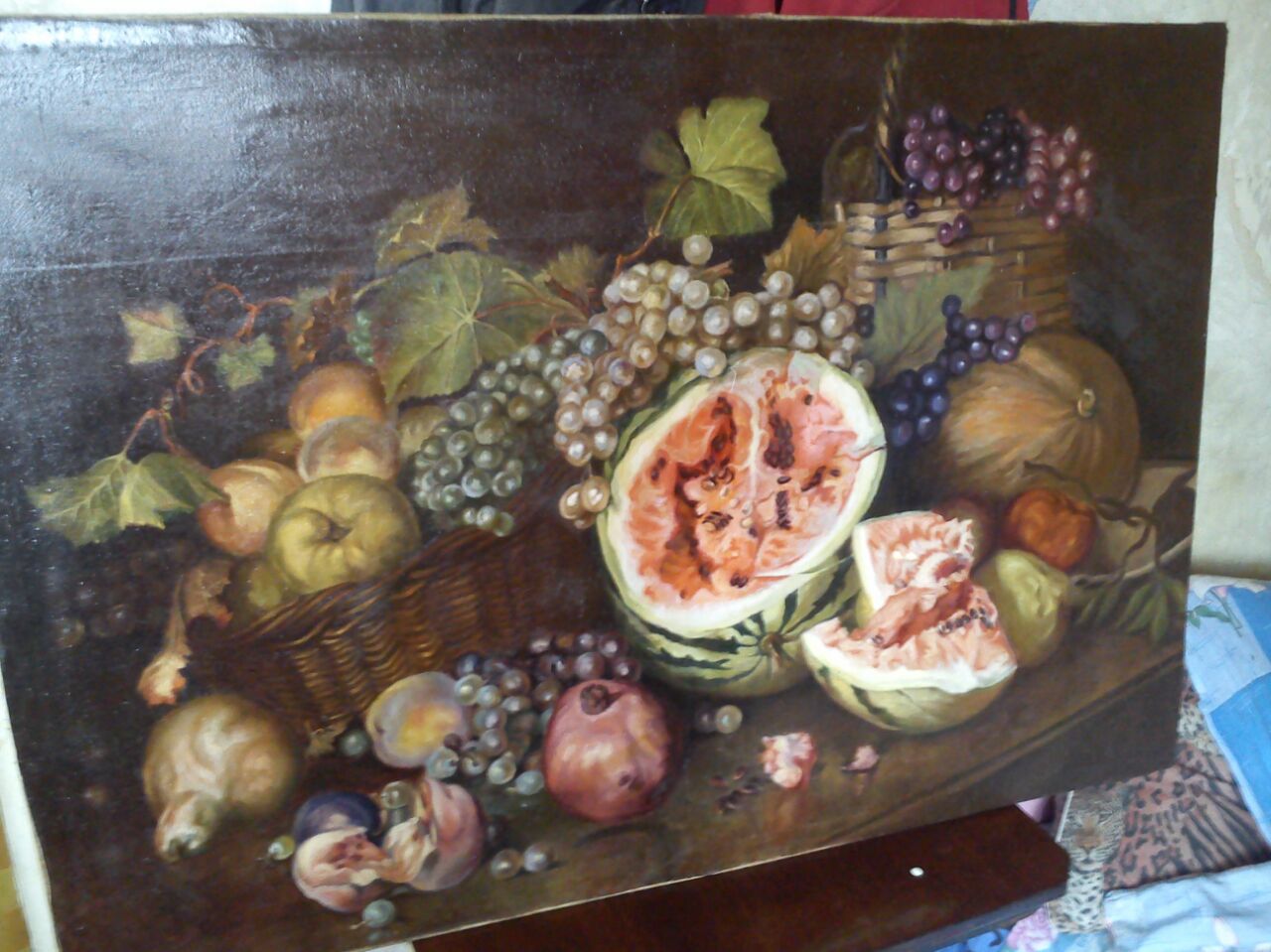 Картина маслом. Натюрморт. Художник не известен. Ориентировочно годов 70-х, 80-х. Размер 116*80см. Очень яркая и красочная. Состояние хорошее. Оценка. Предложения пишите в личку.