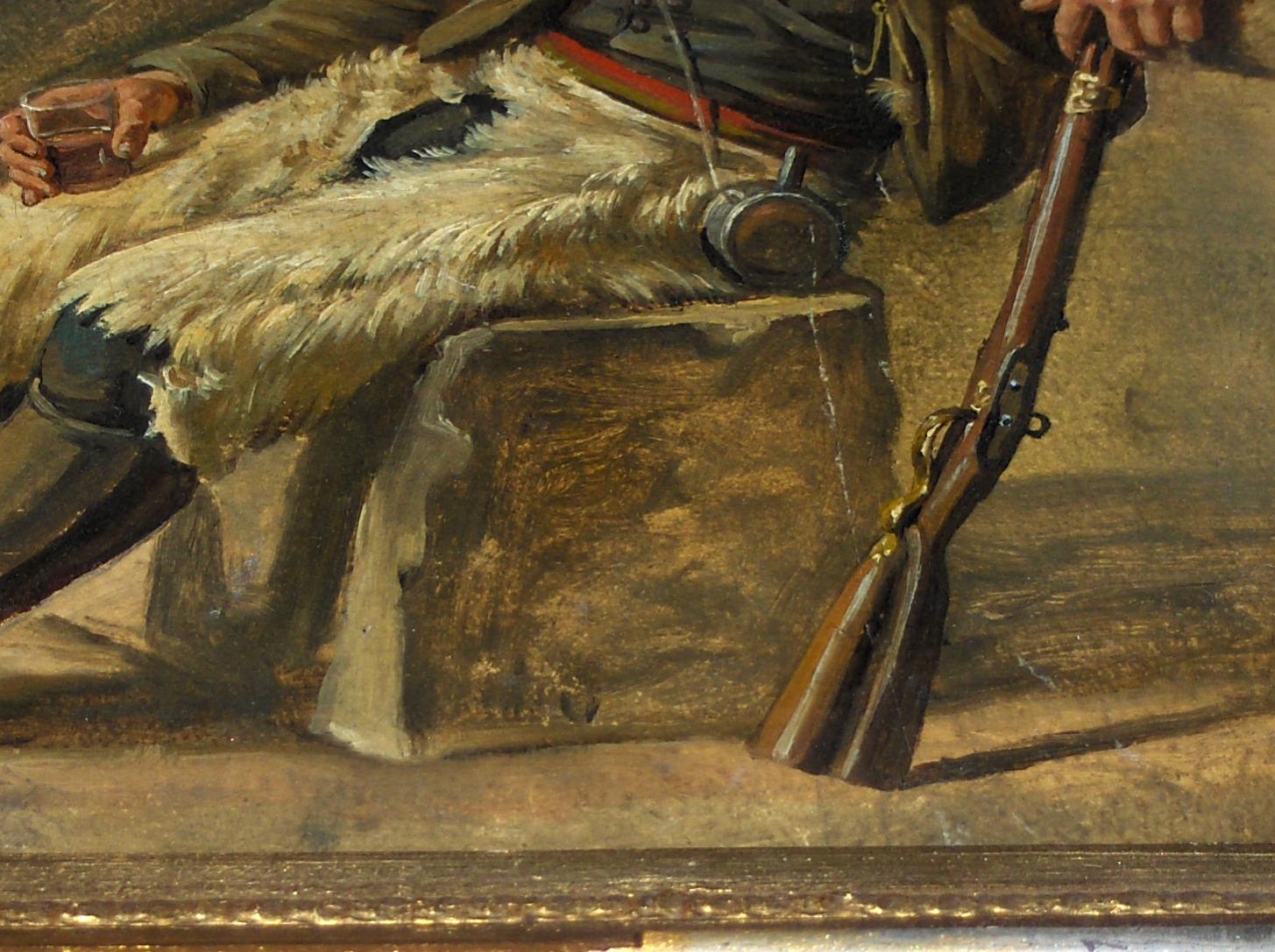 Есть у меня одна работа Леопольда-Луи Робера (ROBERT Léopold Louis, 1794-1835). Называется "Итальянский бандит на отдыхе", масло по бумаге, наклеенной на холст, 19,5 х 26 см. Картина была в русском владении, что следует из старой надписи по холсту а терго. Рама скорее всего родная, на ней трудно различимая дарственная надпись, отчетливо виден только год дарения - 1890. Бирочки 2 шт. + еще какая-то надпись на подрамнике. Прежде чем сформулировать проблему, немного - о художнике. Леопольд-Луи Робер (или Роберт), ученик Эдуарда Жирарде и Жака-Луи Давида, был одним из самых модных художников наполеоновского времени. Настолько популярным, что был избран учителем рисования для Шарлоты Бонапарт, сыгравшей в его судьбе самую трагическую роль. Чтобы мне повторяться, прочитать краткую биографию художника можно здесь: http://www.liveinternet.ru/users/liz...post179773740/ Страшное самоубийство художника (перерезал себе горло шпателем для краски!) и его романтическая любовь к Шарлотте Бонапарт - стали новостью номер один по всей Европе, отразившись во множестве дневников и мемуаров того времени. Его работами восхищались многие большие писатели той эпохи, - включая Дюма, Золя, Бальзака, Вяземского и прочих. Картины Леопольда Луи Робера приобретали не только французские короли и знать, но и русские аристократы, непременно посещавшие его в Италии, считавшие за честь свести с ним знакомство и купить что-нибудь его кисти. Достоверно известно, что его картины, воспевающие романтику итальянского сопротивления, покупали Гоголь и тайный советник, посол в Гаге, Риме и Неаполе граф Николай Гурьев (известный более всего портретом работы Энгра). В чьем владении когда-то находилась моя картинка пока не удалось установить. Но зато я совершила маленькое открытие. Работа эта проходила во французской аукционной продаже как «школы Леопольда Робера» и без подписи. Но подпись есть! Я обнаружила ее, рассматривая картину в сильном косом свете с лупой, а затем и изменяя тон и контраст в компьютере. Насколько я вижу, это две надписи на камне, на котором сидит уставший бандит. (Ставить подпись на камне вообще типично для Робера). Сверху вроде бы так: 2 Х (цифра 2 и икс) Внизу на камне видятся мне две буквы I O или JO или LO, но быть может это цифра 10. Не исключаю того, что это могут быть инициалы другого художника, но тогда возникают, по меньшей мере, два соображения. Надпись на обороте холста по-русски и бирочка по-французски, а так же медная табличка на раме все же утверждают, что это Робер. Тот, кто первый это написал, был уверен в том, что это именно Робер и никто другой. Ни тот же Энгр, ни Изабе, ни Давид, ни Орас Верне (кстати, посещавший Россию) – художники не менее – и даже более – именитые в те времена. Я имею ввиду, что тот, кто подписывал полотно, точно знал, что это картина Робера, что возможно лишь в том случае, если приобретал картину у него лично. Допустим, мы поверим в то, что это работа именно Леопольд Луи Робера, «певца» итальянских разбойников и красавиц. Тогда вопрос. Что мог зашифровать художник? Почему на камне цифры и икс??? |