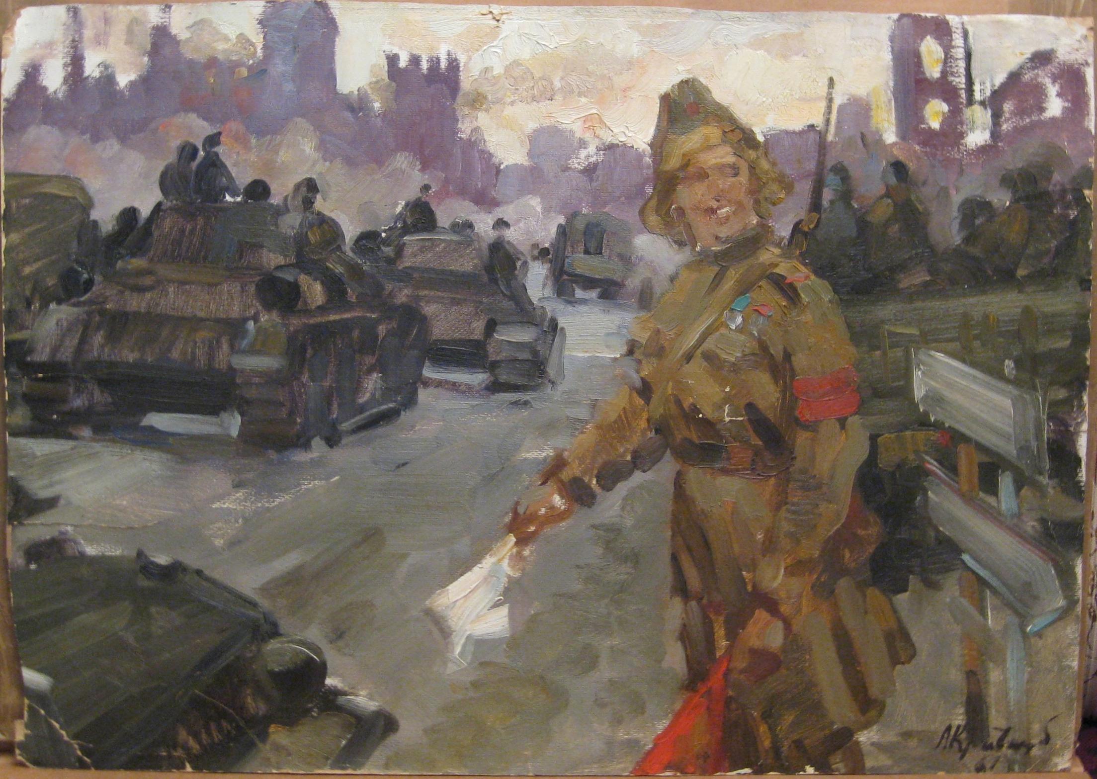 Кривицкий Леонид Гершович "Регулировщица в Берлине", 50 х 70 см, картон/масло.