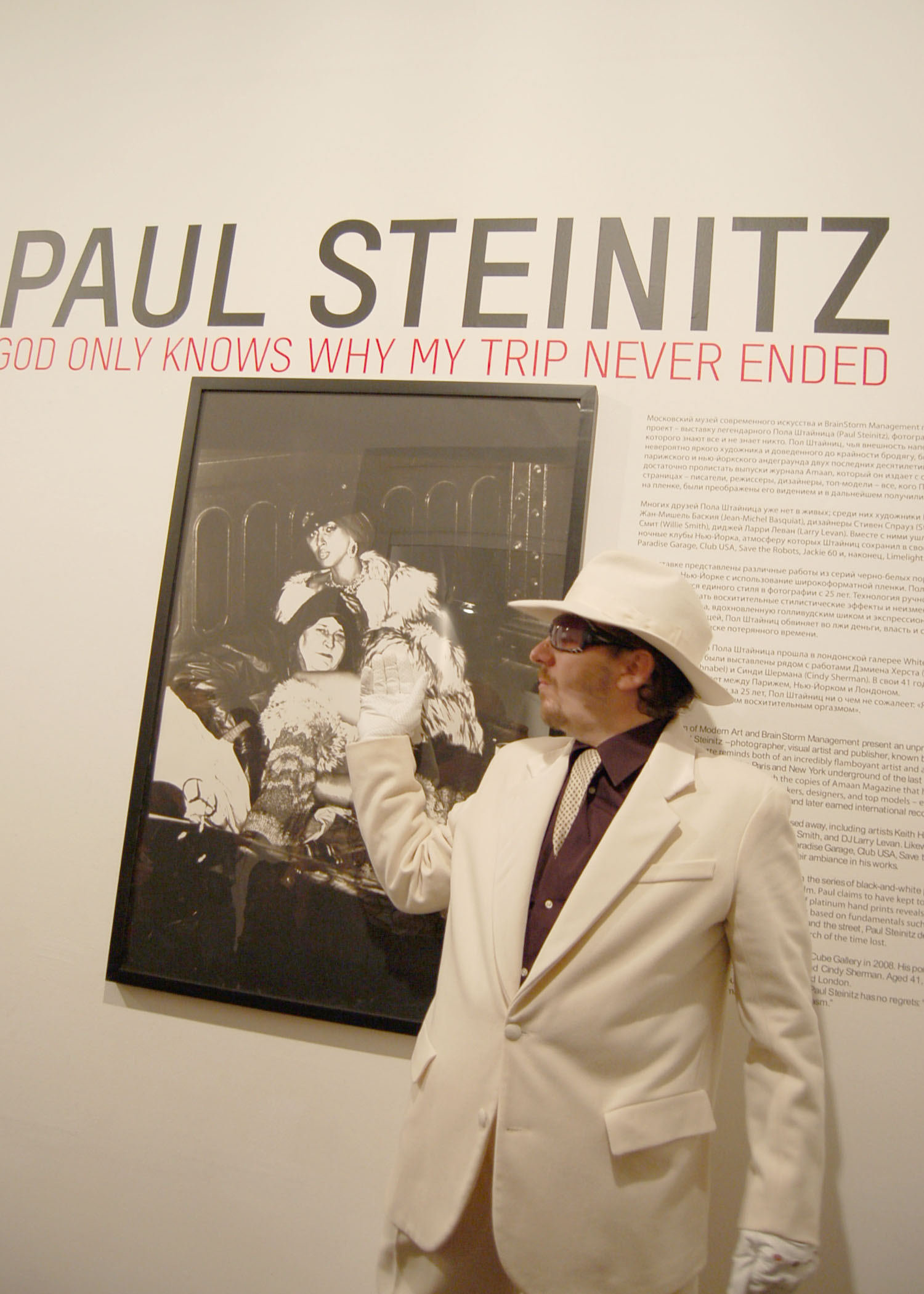 http://artinvestment.ru/news/exhibit..._steinitz.html На выставке с названием God Only Knows Why My Trip Never Ended «И только Богу известно, почему мое путешествие продолжается» было представлено около сотни снимков, на которых были запечатлены известные личности, друзья, знакомые фотографа и просто люди с улицы. Стоит сказать, что на пресс-показе "звезда" вела себя слегка неадекватно, хотя наверно это особенности творческой личности. На предпоследнем фото - Пол Штайниц в окружении своих продюсеров Зака и Джабаха Кахадо, фотографии последнего также можно увидеть на выставке.