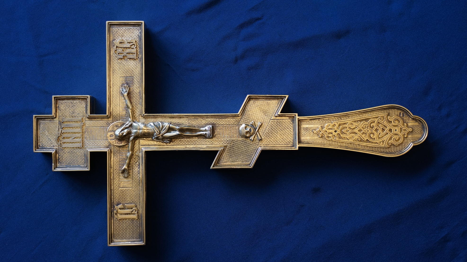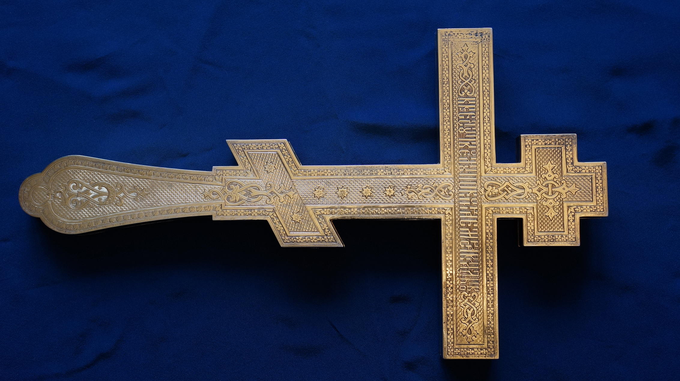 Старинный напрестольный крест большого размера в коробке. Россия, конец XIX века.