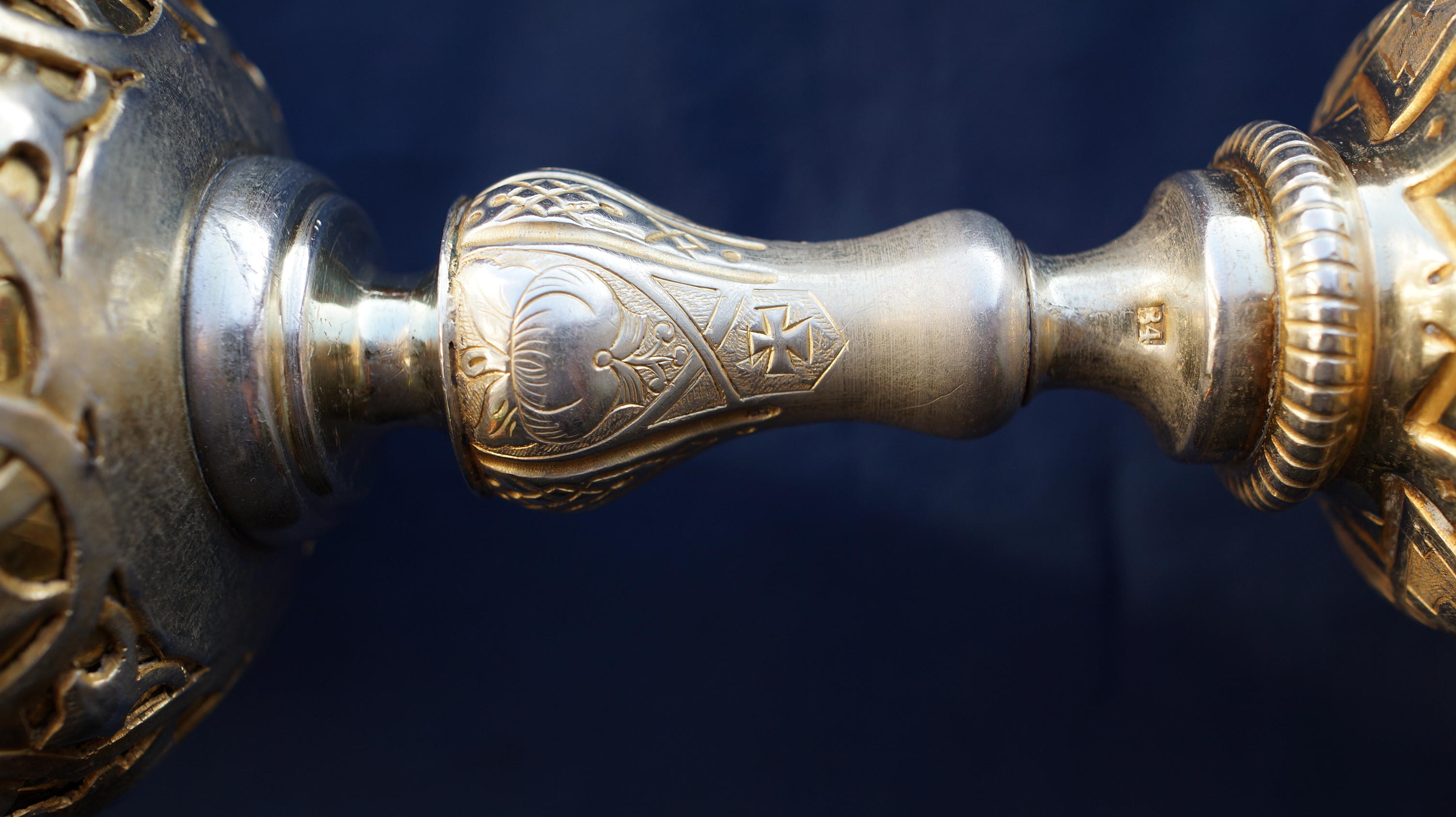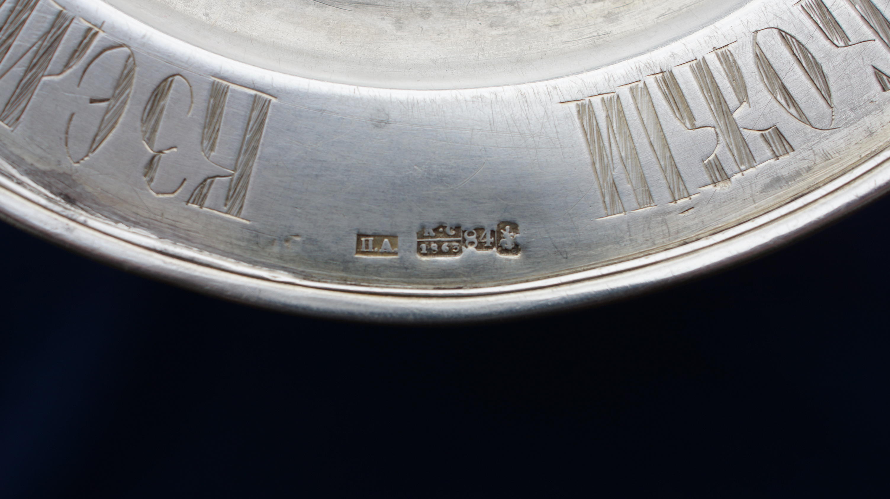 Вес – ок. 1 кг серебра. В отличном коллекционном состоянии. Старинный серебряный позолоченный потир с чашей на 0,5 литра. Мастерская «АВ». Российская Империя, Москва, 1866 год. Материал: серебро «84» пробы, позолота. Техническое исполнение: литье, давление, прочеканка, резьба, ручная гравировка штихелем, канфарение, шлифовка, полировка, золочение, доводка, монтировка. Размеры: Высота - 24,5 см. Диаметр чаши - 10,5 см. Диаметр основания – 13,5 см. Вес - 420 граммов. Клейма: «84» пробы, городское клеймо г.Москвы (св.Георгий Победоносец на коне), пробирного мастера "А.С" (пробирер Свечин Аггей Григорьевич) над датой "1866", именник мастера-монограммиста «АВ» (Векман* Андрей Вильгельмович) в фигурной рамке. Сохранилась родная позолота. Потир в отличном коллекционном состоянии. Работы мастера находятся в ГИМ. * ВЕКМАН Андрей Вильгельмович, СДМ, фабрика сер. изделий, известен в 1860–1886 гг. Предметы быта. посуда. Церковная утварь. Постникова—Лосева: клеймо № 3023. Старинный евхаристический дискос. Мастерская придворного фабриканта Петра Абросимова. Российская Империя, Москва, 1863 год. Материал: серебро «84» пробы, литье, ручная гравировка штихелем, шлифовка, полировка, доводка, монтировка. Клейма: «84» пробы с городским клеймом г.Москвы, клеймо пробирера "К.С" над датой "1863", именник мастера-монограммиста «П.А.» (Абросимов* Петр Евстратович). Размеры: Диаметр - 17 см; Высота – 7,5 см. Вес - 225 граммов. В отличном коллекционном состоянии. Старинная евхаристическая звездица. Мастерская придворного фабриканта Петра Абросимова. Российская Империя, Москва, 1863 год. Материал: серебро «84» пробы, литье, ручная гравировка штихелем, золочение, шлифовка, полировка, доводка, монтировка. «84» пробы с головкой девушки в кокошнике «влево» и альдерманом пробирера «И.Л.» (Иван Лебедкин), именник мастера-монограммиста «П.А.» (Абросимов* Петр Евстратович). Размеры: Диаметр – 16 см; Высота - 9 см. Вес - 180 граммов. [B]В отличном коллекционном состоянии. Цена договорная. Все вопросы пож. адресуйте на эл.почту: arz-wien@rambler.ru |
