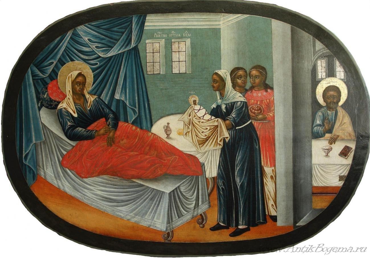 Паволока, левкас, яичная темпера.Доска липа, шпонка врезная. 72,7Х104,5 см. По преданию данная икона происходит из церкви или собора с. Бронницы Московской обл. Первые упоминания в летописи о селе Броничи (совр.Бронница) относятся к 1453 году. Название поселения, по одной из версий, произошло от старинного русского слова «бронник» (так называли мастеров, изготавливавших доспехи для воинов), по другой — от «бронка» («овсяной колос»), по третьей — от «брань» (здесь были частые сражения — брани — с татарами). В конце ХVII века царь Федор Алексеевич Романов организовал в Бронницах первую на Руси ферму для выращивания породистых лошадей. На обширных заливных лугах, принадлежавших сначала великокняжескому, а затем царскому двору, паслись табуны лошадей, здесь заготавливали сено. Богатое и весьма преуспевающее село Петр I подарил своему любимцу — светлейшему князю А. Д. Меньшикову. При нем в Бронницах возвели в стиле московского барокко величественный пятиглавый собор Михаила Архангела. Храм расписывали лучшие мастера того времени во главе со знаменитыми иконописцами Тихоном Филатьевым и Кириллом Улановым. Можно сделать предположение, что высокопрофессиональное личное письмо данной иконы выполнено одним из царских иконописцев, Кириллом Улановым. Иконография данного сюжета сложилась на основе рассказов Протоевангелия Иакова и преданий «Жития Богородицы». Данная икона представляет собой вытянутый по горизонтали овал-таблетку, что характерно для иконостасов барочного стиля. В среднике иконы представлена иллюстрация слов Протоевангелия Иакова: «После явления ангелов настал день родити и роди Анна и рече бабы, что родих, она же рече: женска пола и даст сосец отроковице и нарече имя Ей Мария …». Ложе Св.Анны занимает половину средника с левой стороны иконы. На ложе, укрытым белой с каймой простыней, возлежит Св.Анна. Над ее головой нимб – двойник(золото и серебро), положенный на полимент. Тело ее приподнято двумя узорчатыми подушками: красной и синей. Ноги святой укрыты красно-малиновым покрывалом. Облачена святая в синюю тунику, главу ее покрывает белый плат, концы которого не завязаны, а свободно спадают на грудь. Над голой Св.Анны многочисленными складками свисает пышный полог синего цвета. Рядом с ложем стоит круглый стол, покрытый белым убрусом, на котором стоит серебряный кувшин с питием и лежит хлебец. У стола стоят бабка-повитуха и две молодые служанки. Повитуха облачена в синие одежды с белым платом на голове. Она держит на руках, покровенных белым платом, запеленатую Младенца-Богородицу. За спиной повитухи стоит молодая служанка, облаченная в белую тунику и розово-малиновую столу, она держит в руках небольшое блюдо. Стены покоев светлые, бирюзово-голубые. Напротив стола расположены два окна с решетчатой рамой. Пол охристо-оранжевый. Справа за стеной с арочным проемом, ограниченным широкой пилястрой, сидит Св.Иаков. Он сидит за столом, укрытым белым убрусом. Правая рука его приподнята в благословляющем жесте, левая покоится на столе. Тут же перед ним стоит серебряная чаша и лежит Евангелие в кожаном переплете с запонами. Святой облачен в синий хитон и охристый гиматий. Вокруг головы – нимб, выполненный двойником. За спиной Св.Иакова в глубине интерьера видна стена с двумя окнами, выполненными сусальным серебром. Письмо одухотворе