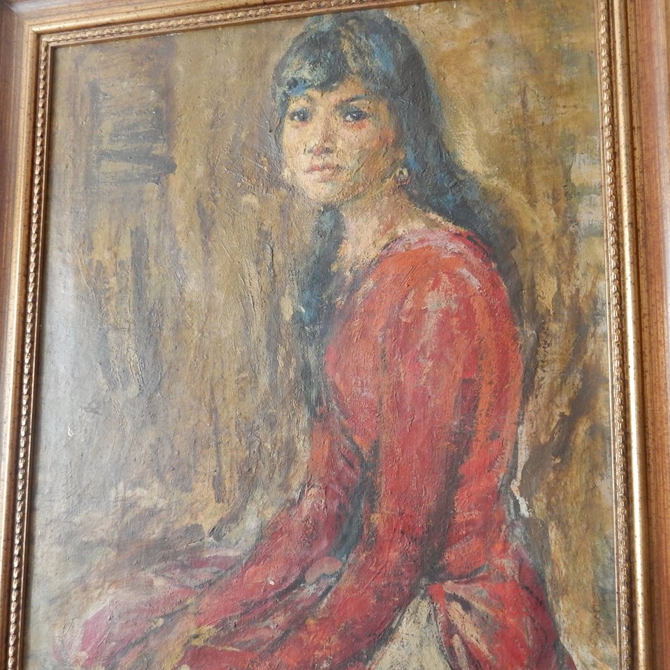 Девушка в красном платье. 1948 год. Холст, масло. 80,5х69,5 Тот же год, что и хрестоматийная "Дочь Советской Киргизии". Портрет девушки в той же манере, что и широко известный автопортрет. Вещь уникальная. Вещь откровенно музейного значения. |
