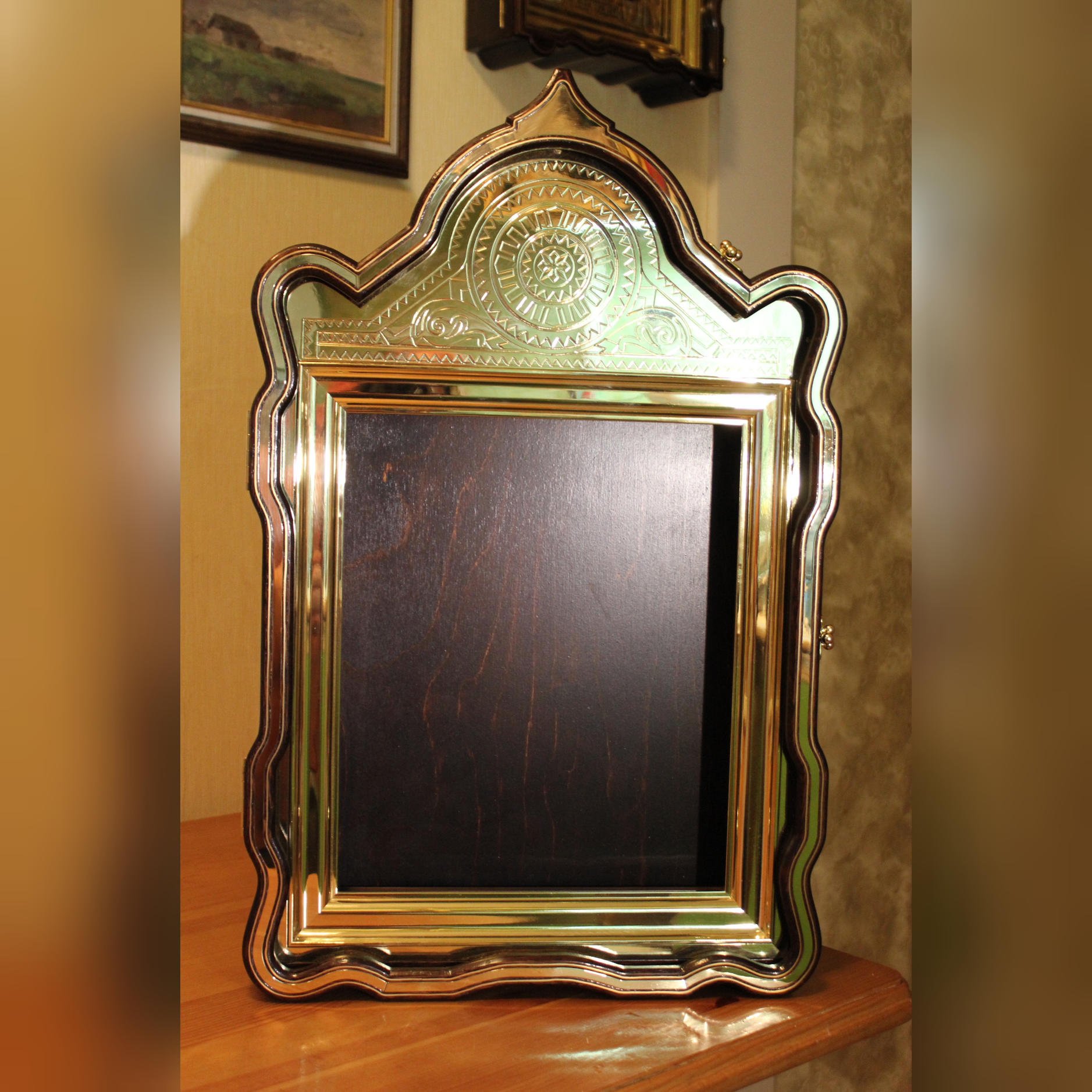 Латунная проволочка, врезанная в дверцу киота на 2 мм. Рамка - латунь. Навершие - латунь. Вся латунь отполирована до зеркала. Под аналойный размер иконы. Цена 35 т.р.