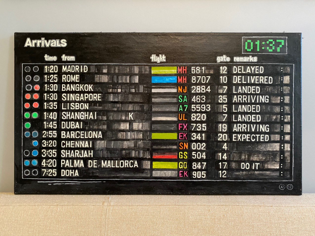Алексей Спай, «Departures» и «Arrivals» из серии «Первым делом самолёты», холст/масло/флуоресцентная краска, 60 х 90 см., 2017 г.