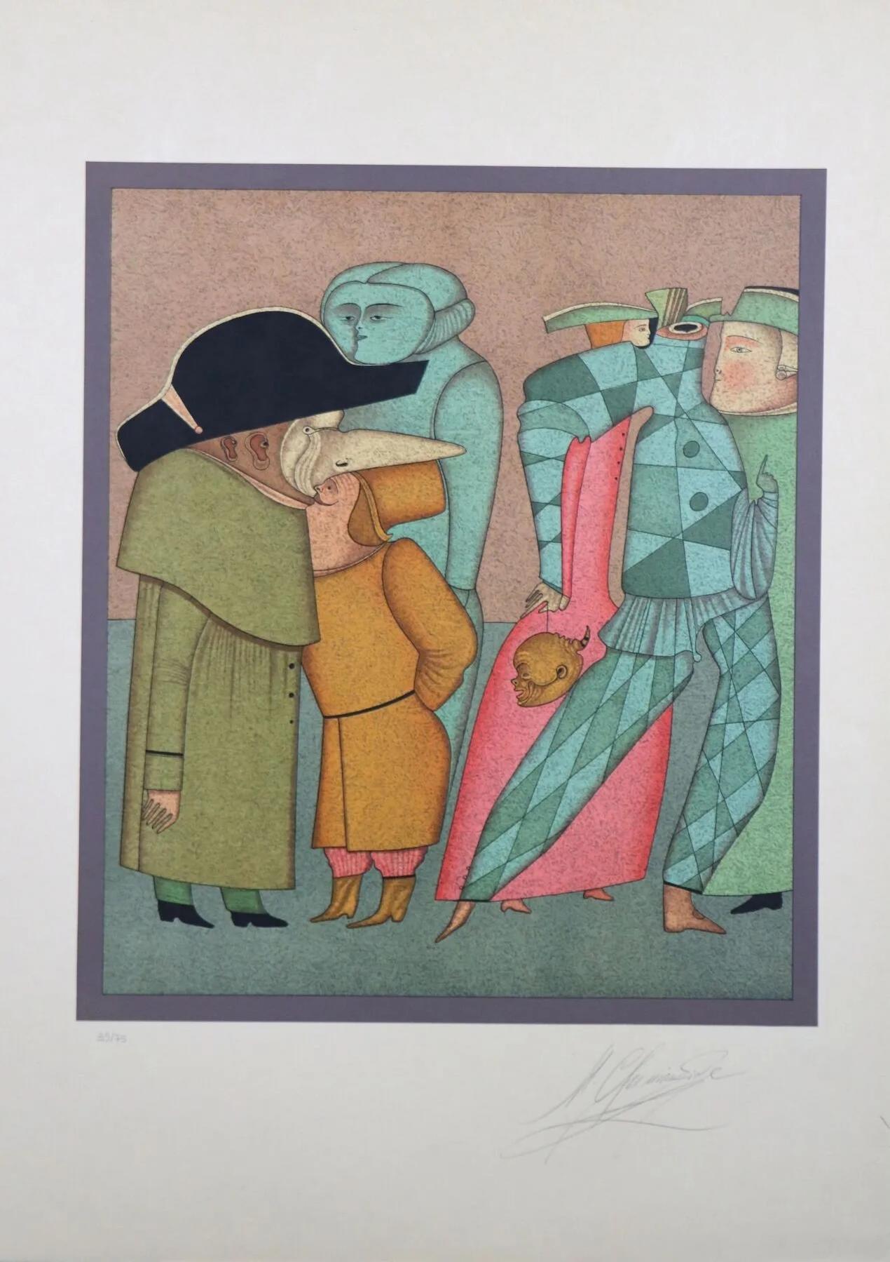 ● Размер листа: 75,5 × 54 см, изображения: 48 х 41 см ● Подписано и пронумеровано художником ● Страна: Франция ● Год: 1988 ● Тираж: 39/75 ● Бумага: Japon (наиболее ценится у коллекционеров) ● Литографии созданы в ателье Grapholith, Париж Также в папке — лист с текстом Michel Lancelot о художнике и серии «Карнавалы Санкт-Петербурга», лист с описанием общего тиража и указанием места изготовления литографий. Михаил Михайлович Шемякин (1943) — художник, скульптор. В 1971 г. выслан из СССР, жил во Франции, с 1981 г. - в США, в 2007-м вернулся во Францию. Творческие исследования М. Шемякина послужили основой для создания Института философии и психологии творчества (Франция). В 2000 г. учредил Воображаемый музей (г. Хадсон, штат Нью-Йорк). Почетный доктор Европейской академии искусств Франции и ряда университетов. Фантасмагории, гротеск, маскарад, мистерии – основные сюжеты, с которыми работает Шемякин. Такой выбор дает широчайшие возможности для полета фантазии. Художник создает новый мир, основываясь на своем смелом воображении, и этот мир полон самых причудливых существ. Стоимость в Интернете 600 000р (пример 1, пример 2). Цена договорная, пишите личным сообщением.
