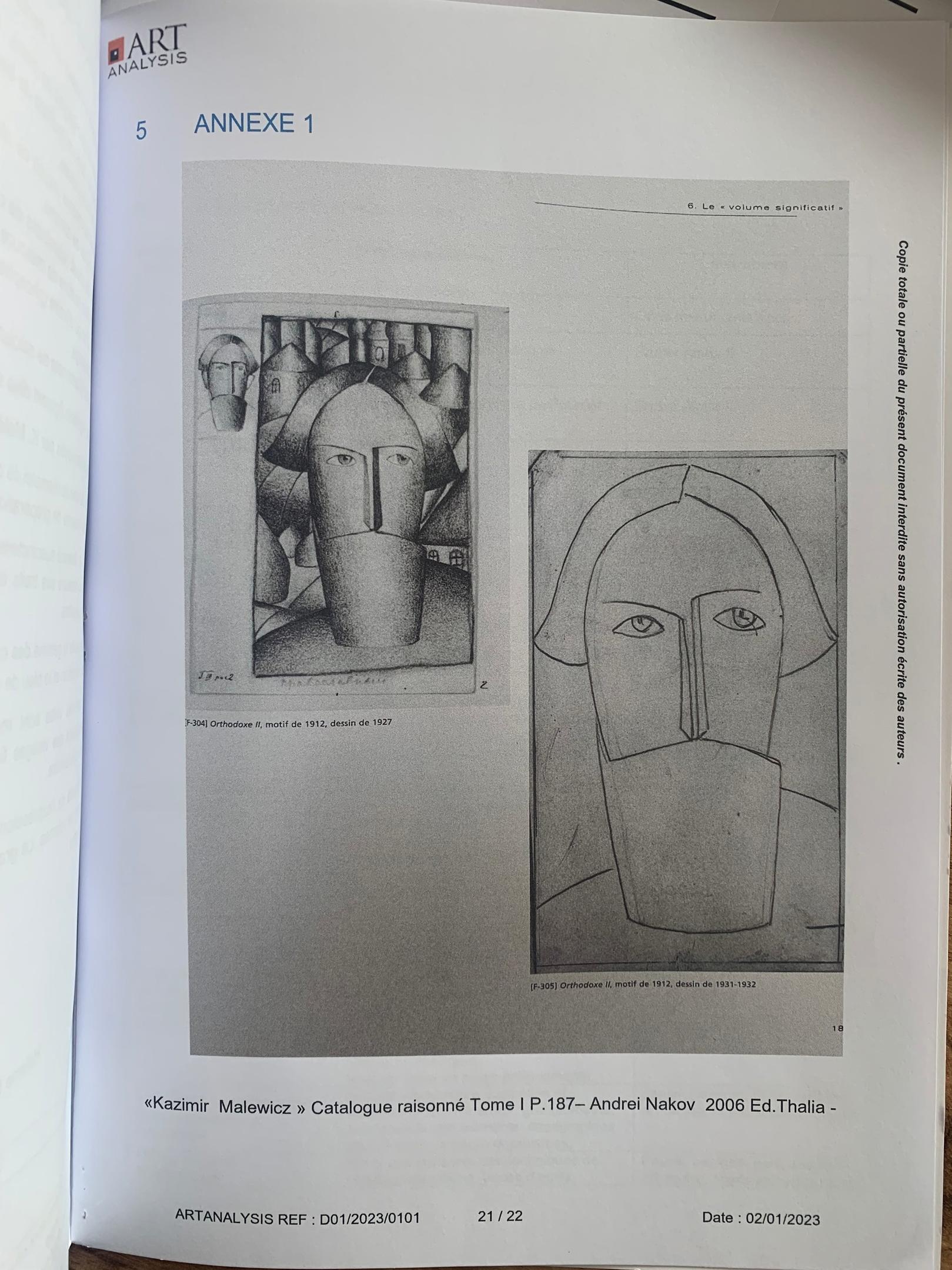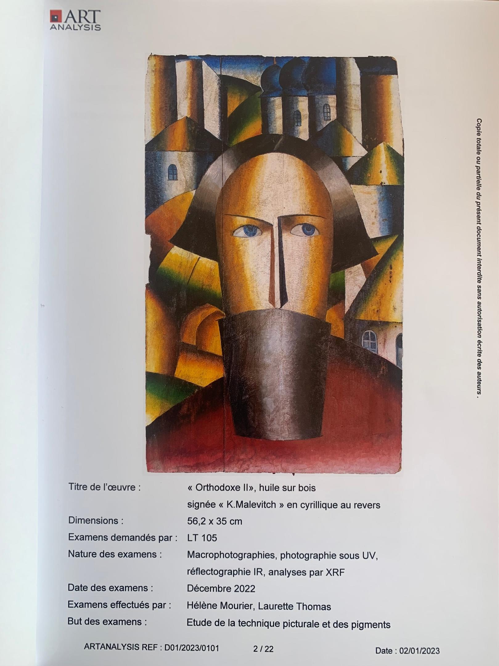 Оценочная стоимость: €150 000 / €200 000 Работа создана около 1931-1932. Дерево, масло, подпись "К. Малевич" кириллицей на реверсе, 56,2 х 35 см. Сертификат подлинности от госпожи Патриции РЕЙЛИНГ. В России у специалистов ее атрибуция вызывает вопросы. Библиография: Андрей Наков, Казимир Малевич, Каталог-резоне, изд. Thalia, 2006, том I, работу можно сравнить с 2 воспроизведенными подготовительными рисунками F-304 и F-305, с. 187. Проведено исследование живописной техники и пигментов лабораторией Art Analysis 2 января 2023 года. https://vk.com/wall-205067071_404