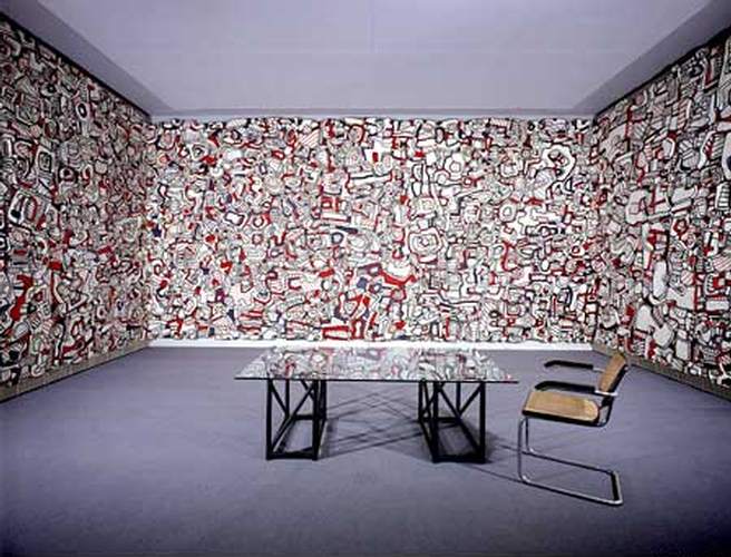 1945 г. – Выставка литографий в галерее Андрэ. Знакомство с Анри Мишо. Поездка в Швейцарию, где он занимается исследованием «грубого, первозданного искусства» (art brut). Дюбюффе ввел этот термин для определения искусства непрофессиональных художников, работающих вне норм, не связанных с артистическими кругами, обратившихся к творчеству в результате некоей социальной или психологической травмы - душевнобольных, заключенных или просто детей. И сам он добивается в своем искусстве независимости от интеллекта.