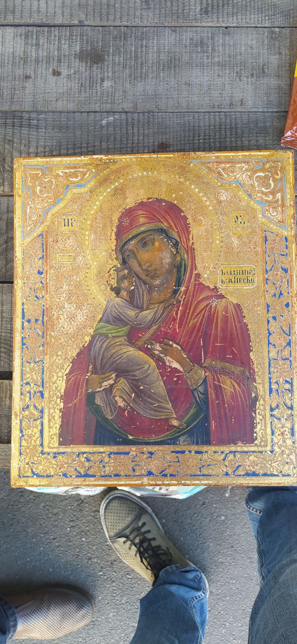 Иконописный тип Елеуса (Умиление) - "пяточка" Иисуса, соединение нимбов. Имеет хороший потенциал при продаже без реставрации - Владимирскую икону в народе любят. Ценно, что нет ходов жучка - возможно, доска кипарис. |