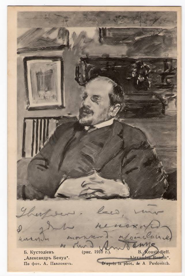 Автограф Александра Бенуа на почтовой открытке Общества Св. Евгении с портретом работы Б. Кустодиева (1910) будет представлен на сентябрьском аукционе "Антиквариума"