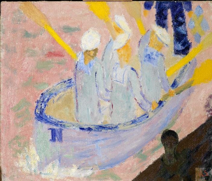 As a signature-monogram "RS", and the style of painting (including the characteristic perspective distortion), in my opinion, may suggest the authorship of Swedish artist Ragnar Sandberg (Ragnar Sandberg, 1902 - 1972). It is - quite a famous artist in the network a lot of reproductions of his works. But, of course, I would not take his claim authorship unambiguously.