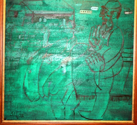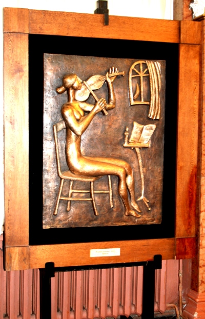 Выставка большая, привезли более 100 произведений, разместили в двух залах. В большом (в музее его называют Мраморным)-живопись, скульптура, бронзовые рельефы, в меньшем (на первом этаже)- шелкографии, очень интереные рельефные (или объёмные, как указано в описании) эмали.
