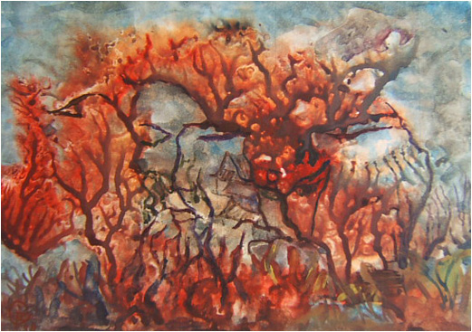 1)«Смотрю на горы, и горы смотрят на меня. И долго так глядим мы, друг другу не надоедая» - http://moydao.ru/gallery/7.html величественное состояние единения с миром. Как мне жаль, что свечение экрана компьютера, убивает благородный перламутровый блеск этой работы! 2)« Сокровенное» - http://moydao.ru/gallery/6.html состояние мучительного любовного переживания, поражающе искреннего и откровенного. Портрет самого Художника, в правом верхнем углу, сразу не бросается в глаза. Он как бы прикрыт первым зрительным планом, в котором – два обнаженных торса, мужской и женский. Любовное томление исходит от них. Тем острее воспринимается страдающий лик самого Художника. И как это по-джентельменски, как в духе Георгия Николаевича – спрятать образ любимой женщины! Он – здесь, он – есть, но не каждому его увидеть! 3)«Судьба моя» - http://moydao.ru/gallery/5.html состояние момента счастья и гармонии. Эта работа – двойной автопортрет. Первый – видимый, в окружении любимой женщины и мифической музы. Художник восторженно и вдохновенно вознесся над морем цветущего урюка. Второй – печальный, нервно восприимчивый, еле уловимый. Он врос своими чертами в розовое марево. Двойственность порывов и ощущений говорит не о раздвоенности личности Художника, а о сложности, неоднозначности его натуры. Символическое значение имеет образ старца в правом верхнем углу. Георгий Николаевич часто рассказывал занимательную историю из своего детства, как однажды, в жаркий летний полдень он увидел старика, облачно белого, в корейских белых штанах, с непокрытой головой. С искренним удивлением он описывал, как развевались в безветренном воздухе его длинная борода и усы. Это детское видение оказало влияние на его творчество. Культ старика, мудреца прослеживается во многих его акварельных работах и в мелкой пластике. В данном случае – призрачный старец как бы развертывает и читает свиток судьбы Художника. И вместе с ним, сам Художник размышляет – какая же была его судьба? Последний раз редактировалось Елена Ким; 09.11.2010 в 21:36. |